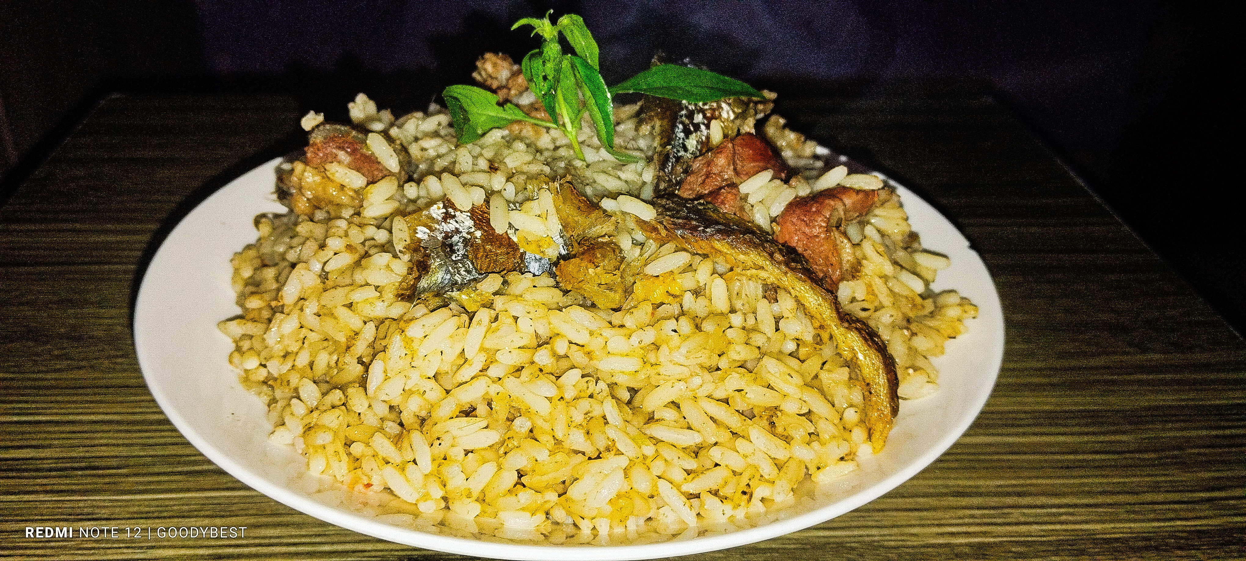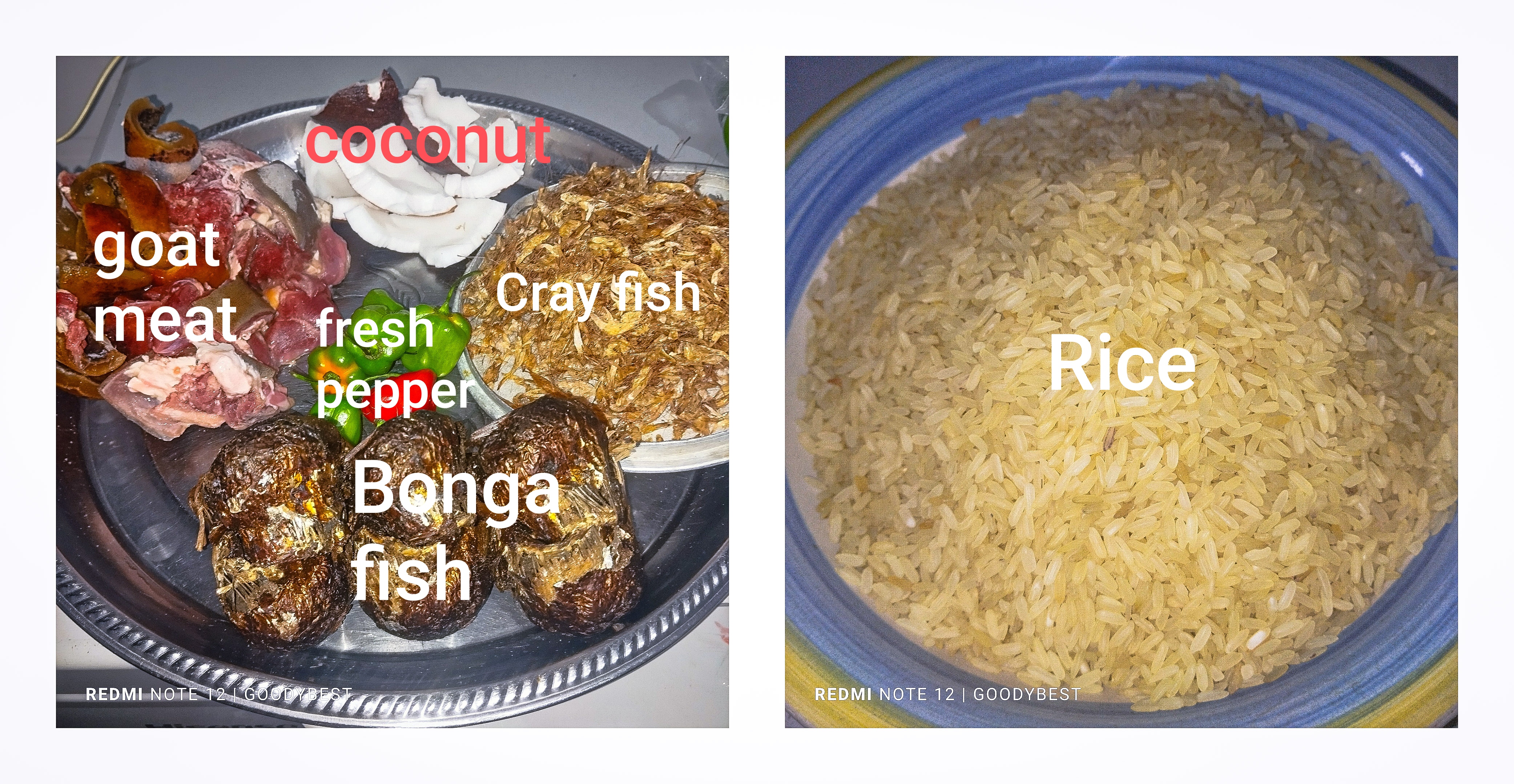 - Rice, Coconut 🥥, Crayfish, Bonga fish and Goat meat.