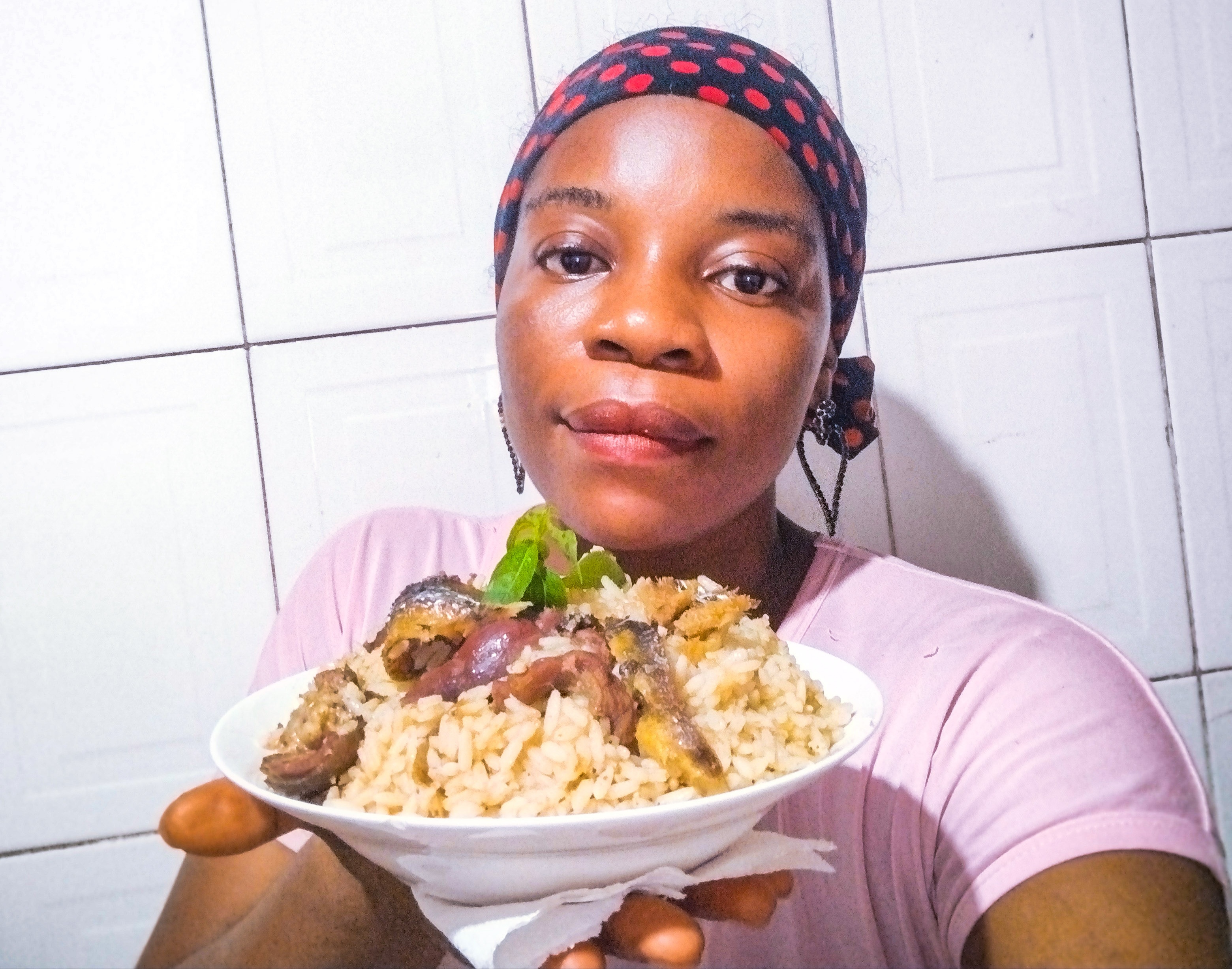 Wash, season, and cook your goat meat; when the meat is tender, pound your crayfish and add to the stock; add fish, pepper, seasoning cubes, onions, and salt to your taste. Add the rice and Then pour in your coconut milk. Let the water cover the rice and cook it.