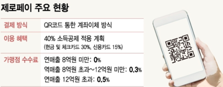 제로페이는 서울시와 중기부가 만든 소상공인 간편결제 시스템으로, QR코드를 활용한 계좌이체 방식의 결제 서비스다. 소비자는 네이버페이와 페이코 등 기존의 간편결제 앱이나 은행 결제 앱으로 제로페이 가맹점에 비치된 QR코드를 휴대전화로 스캔한 후 거래금액을 입금하면 된다. 가맹점주가 가맹점용 앱을 통해 이를 확인하면 거래금액이 소비자의 은행 계좌에서 가맹점주 계좌로 곧바로 이체된다.