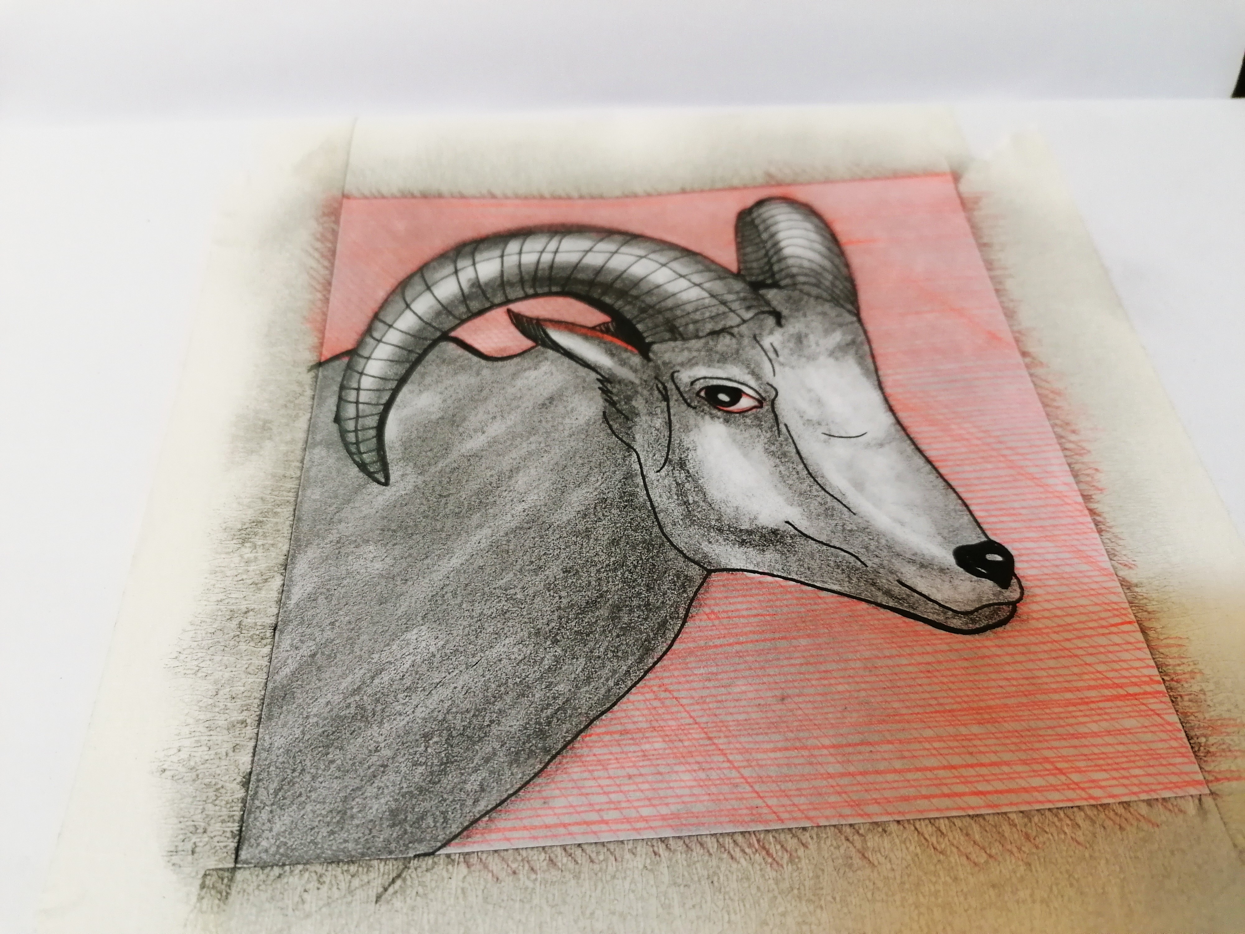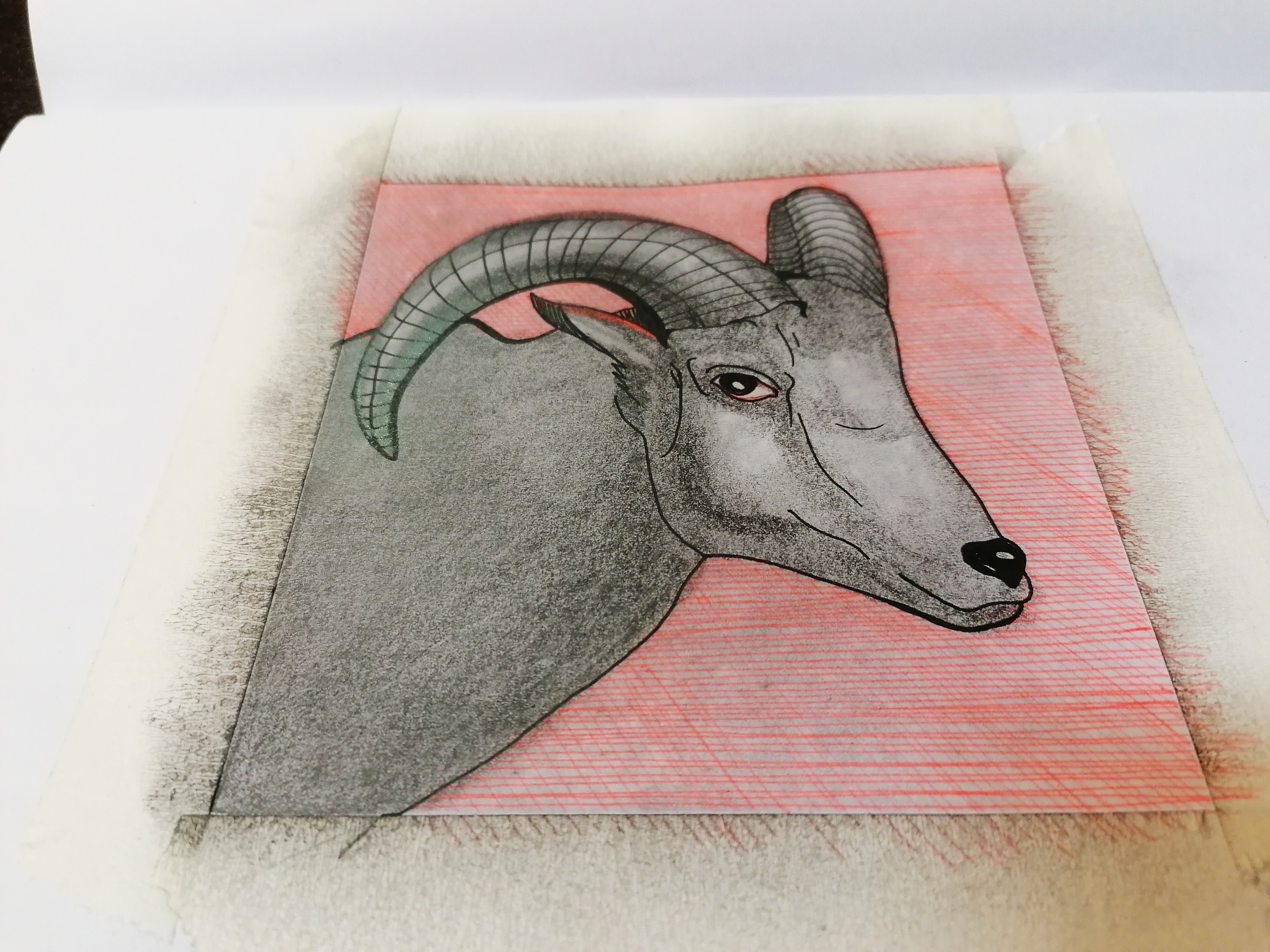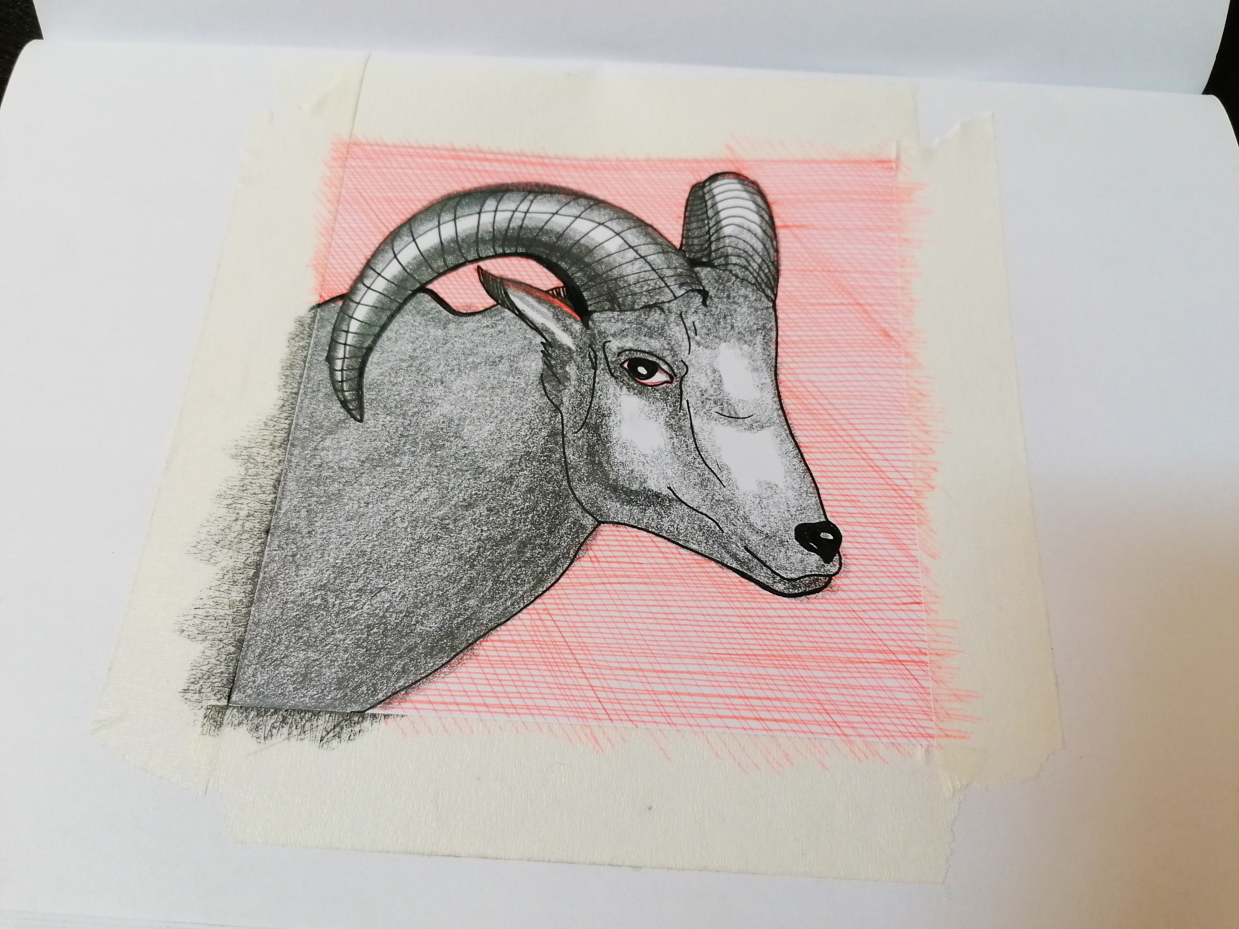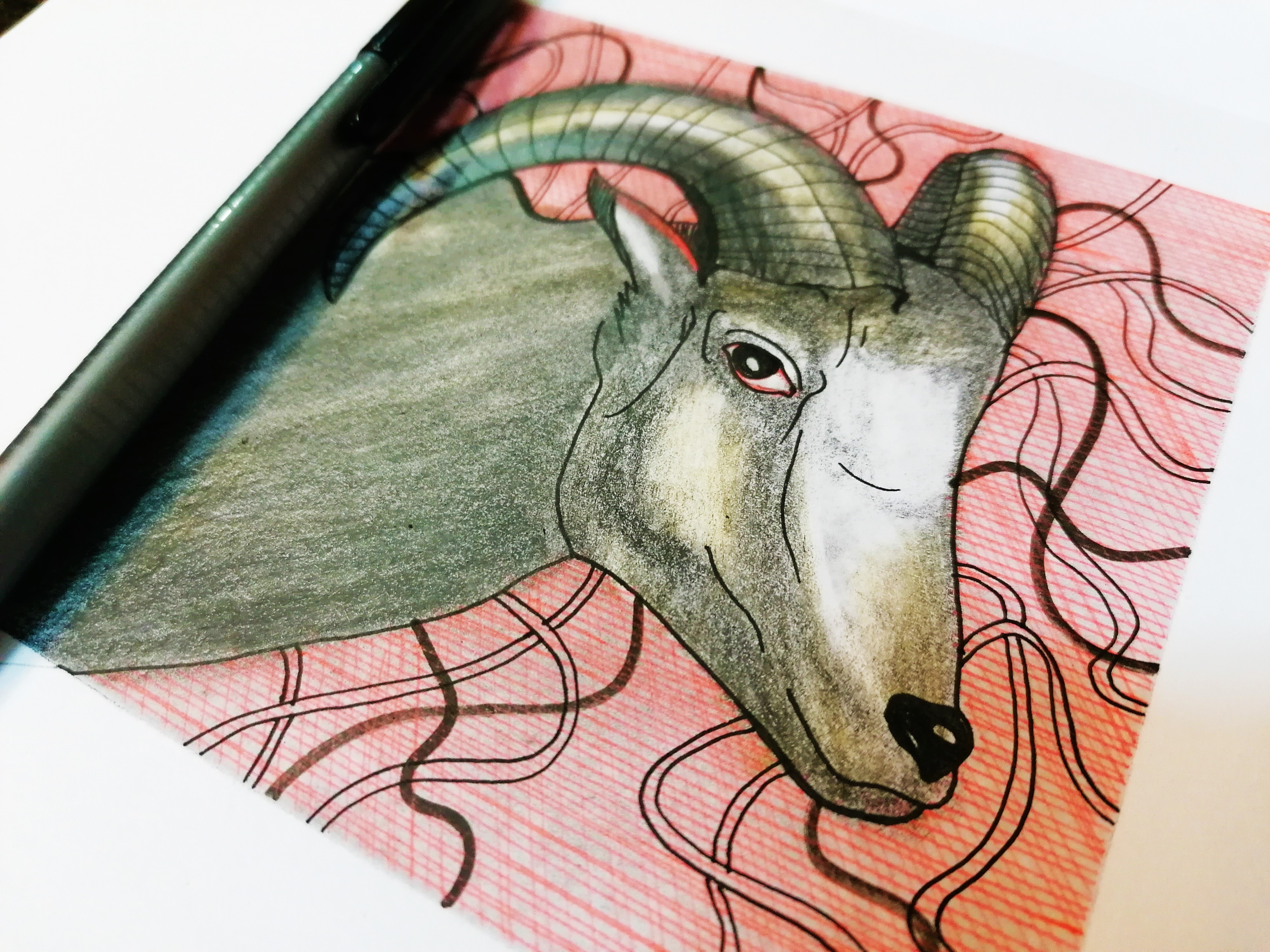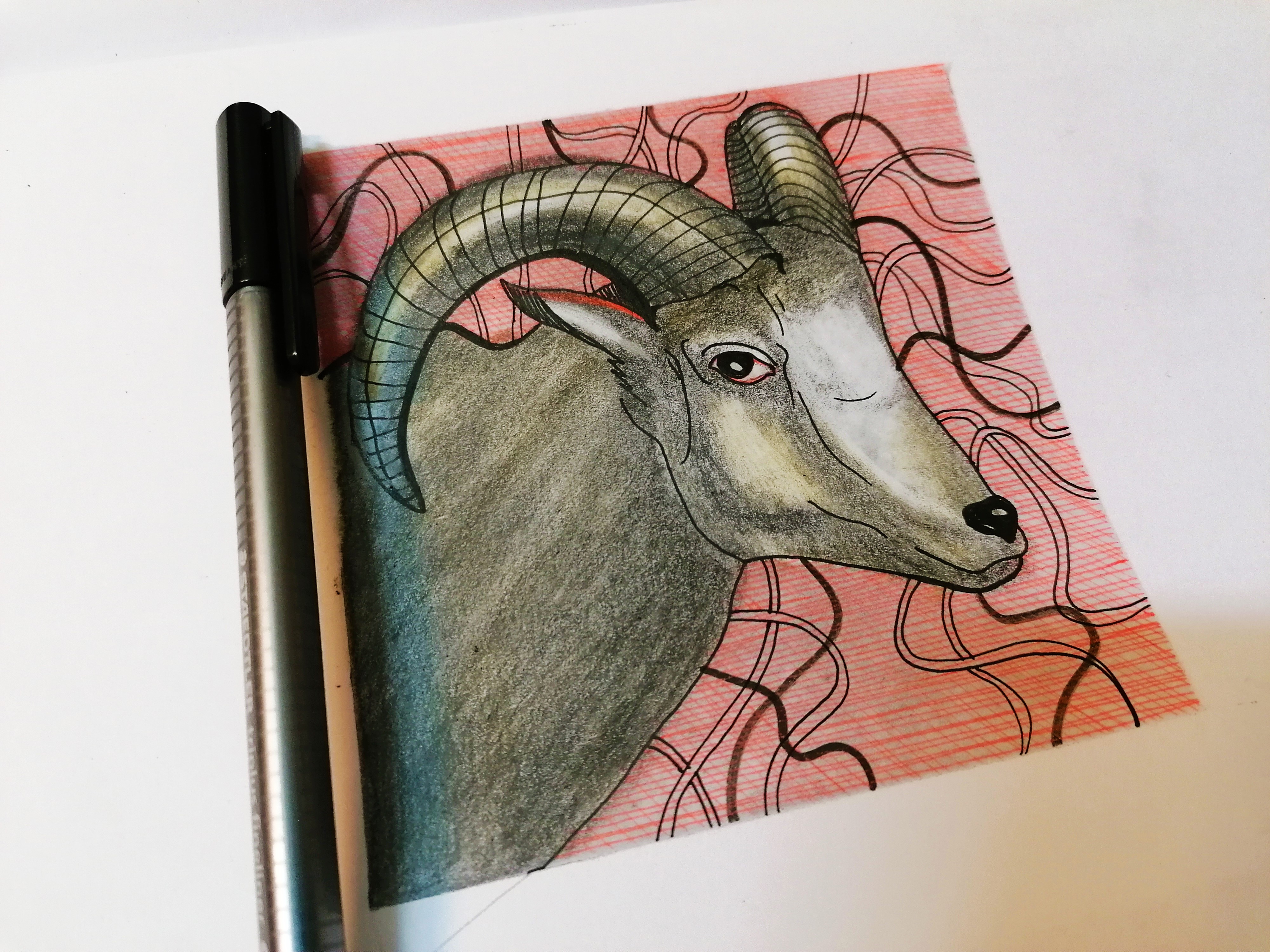 drawing male goat , with hatching on it's background ,red pen and black pencil