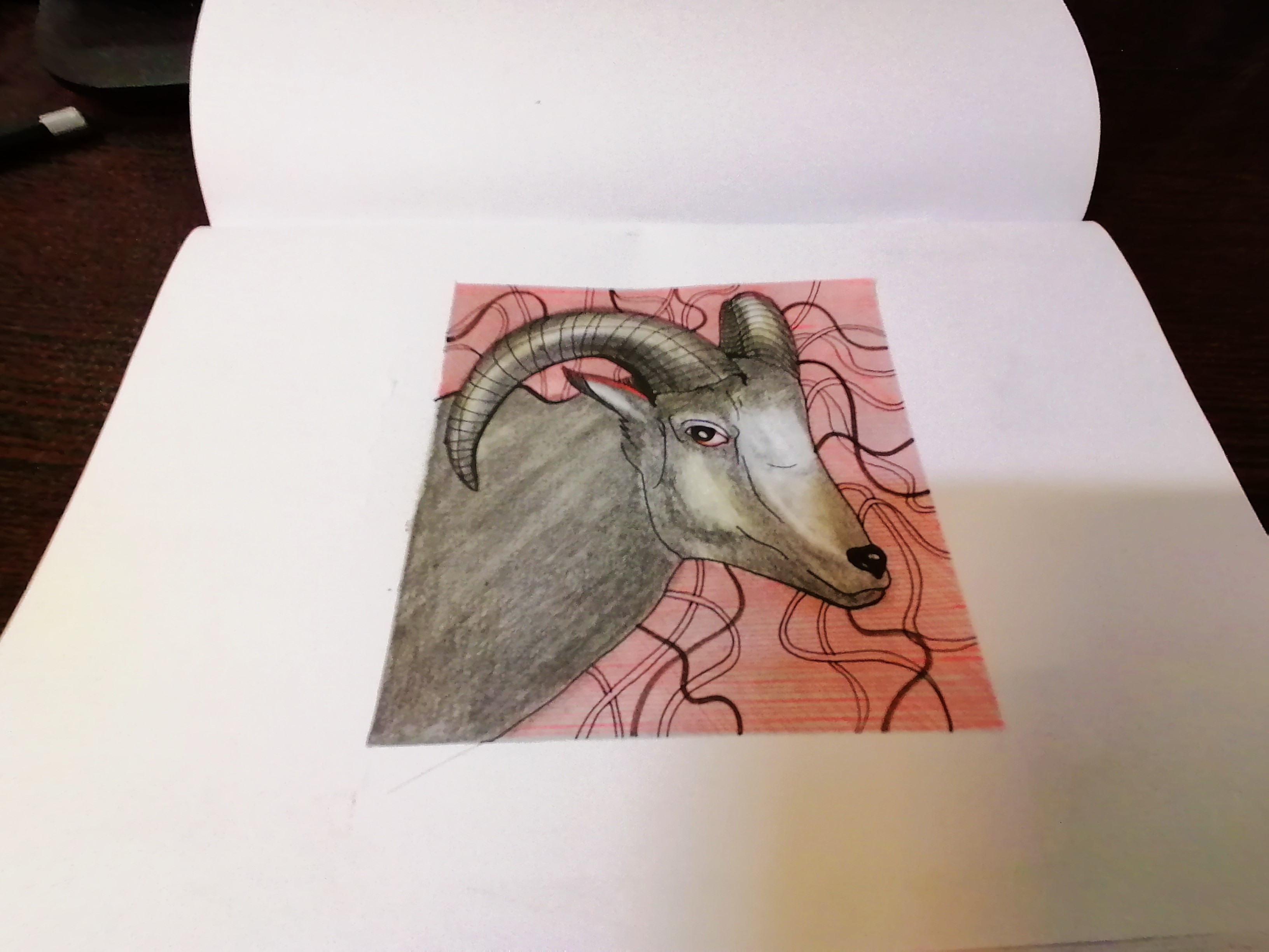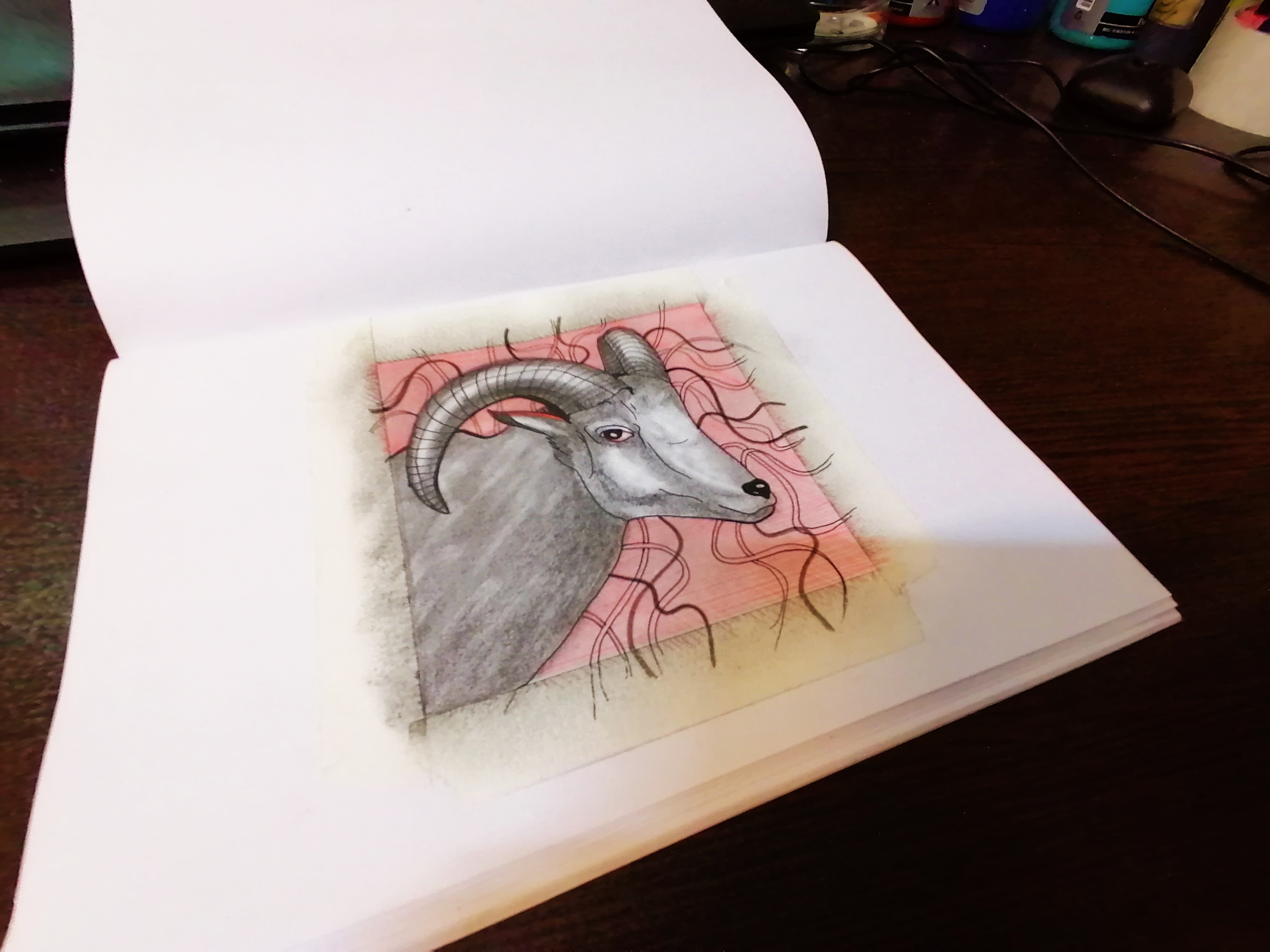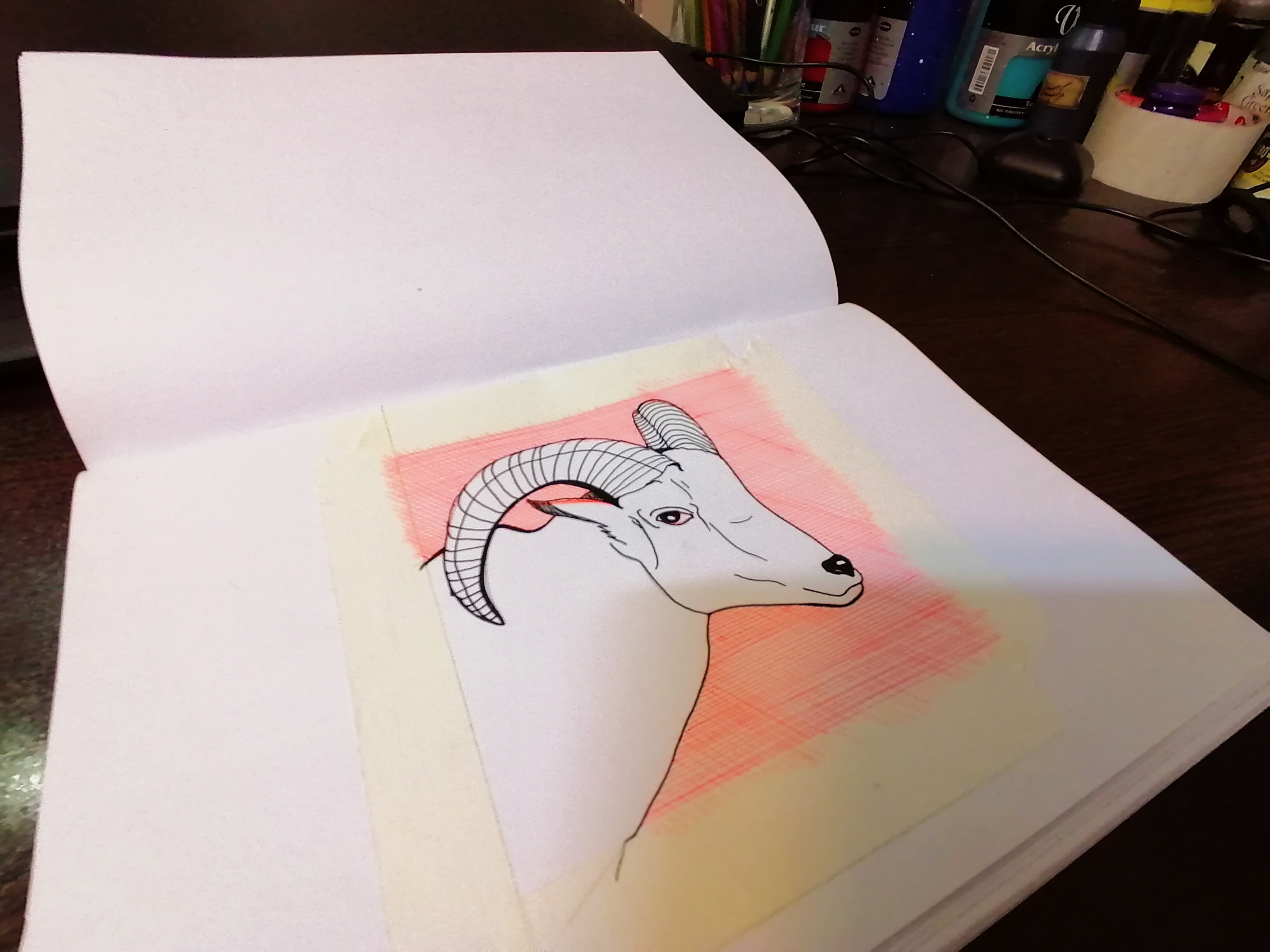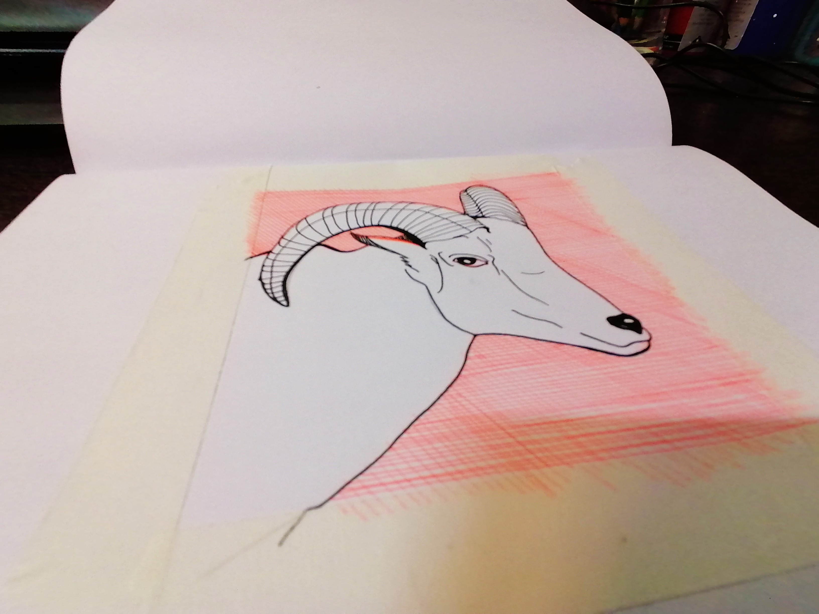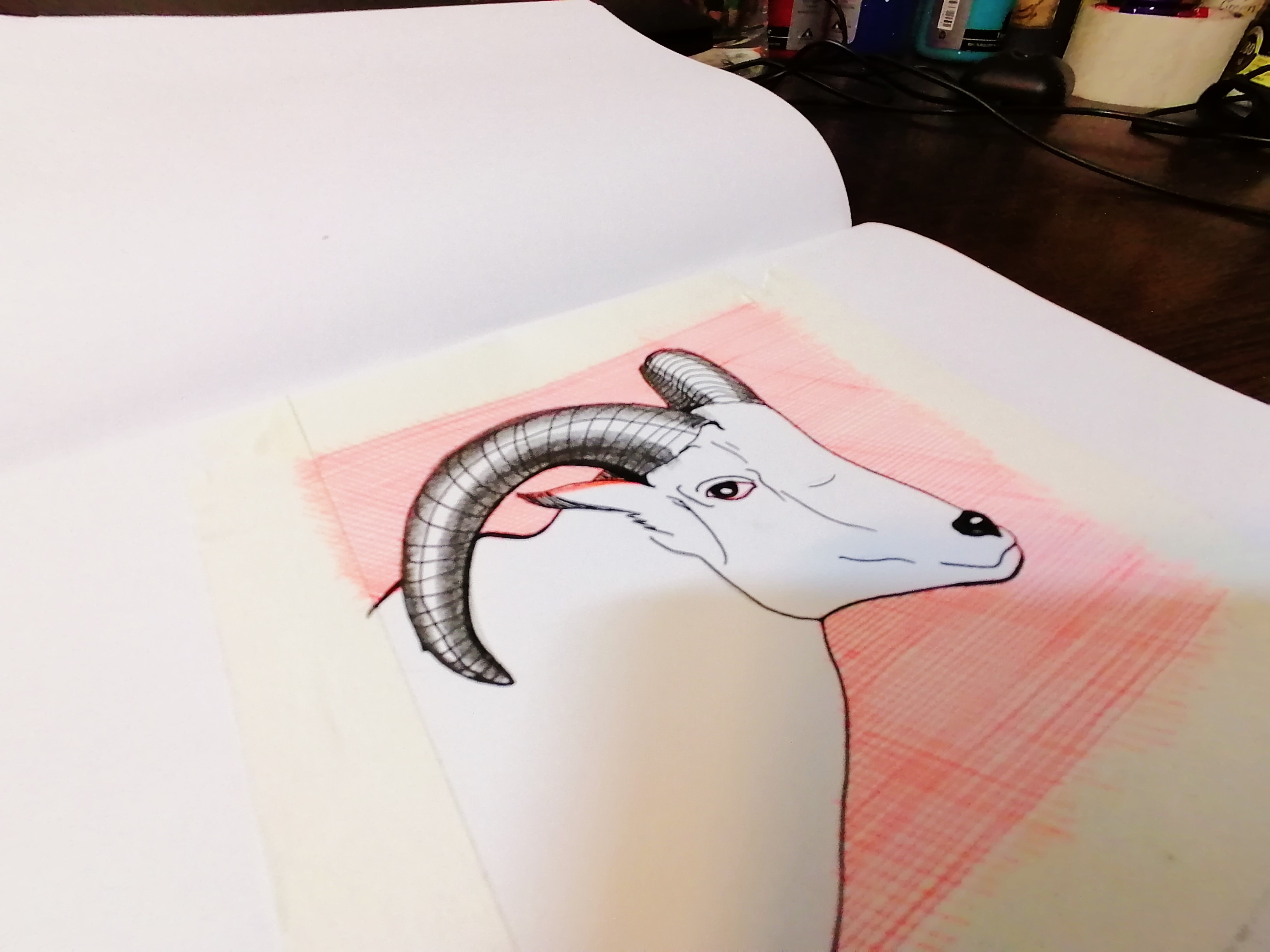 drawing male goat , with hatching on it's background ,red pen and black pencil