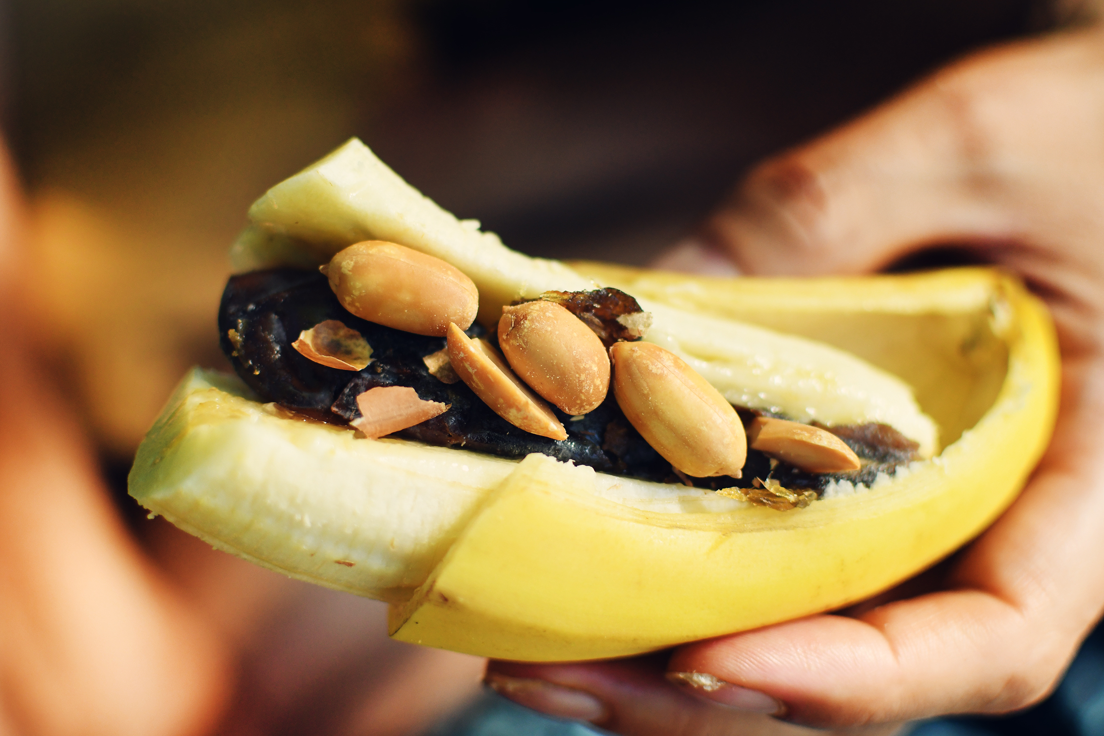 The bananas were slit with dates and I happened to have some peanuts in my bag so we had a banana split but not the traditional kind.