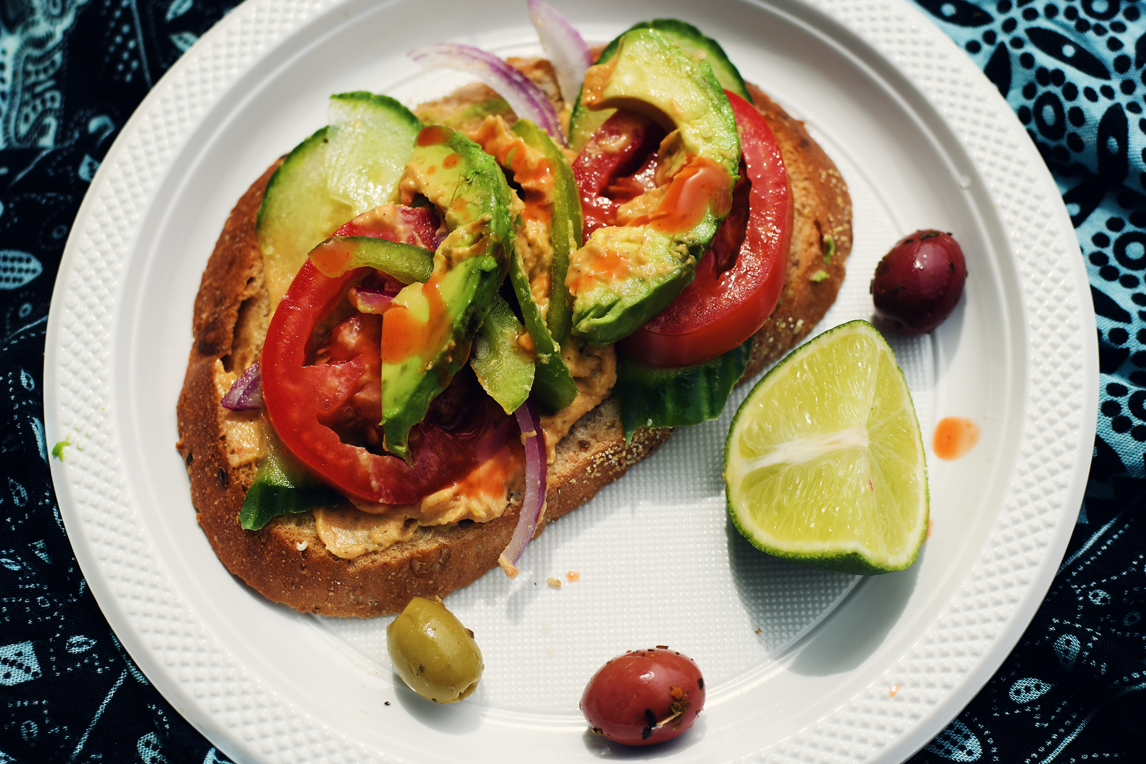 We just through random fruits, veggies, bread, hummus, and of course some hot sauce, which was not that hot but it did the job.