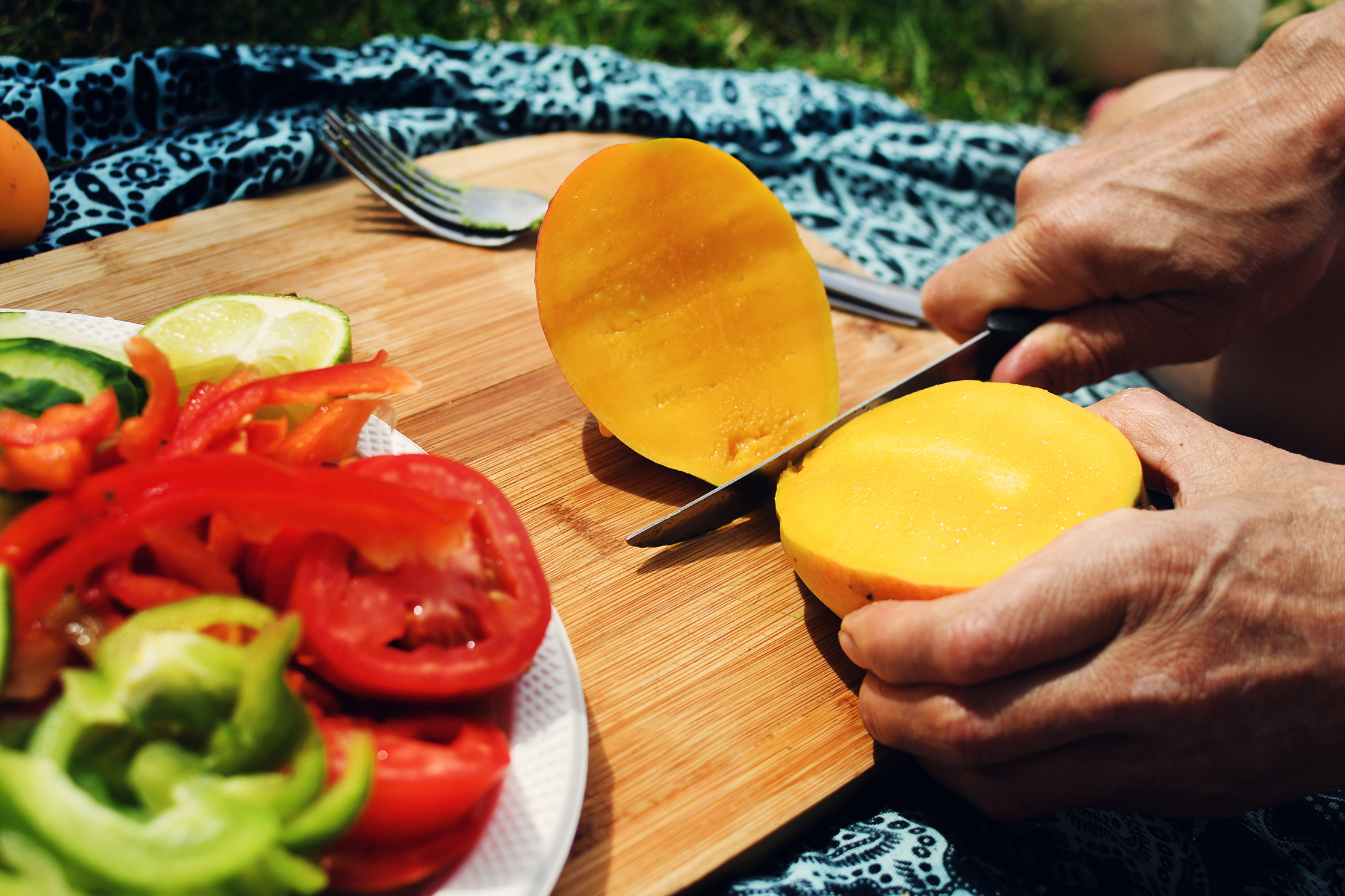 We dashed into the kitchen and starting prepping. When it was almost done, mother in law came in from outside and started kitchen projects that didn't involve making food. Shortly after father in law came home and now the kitchen had four of us and a big dog in our way. The folks were grumpy suddenly and in was over. We put our stuff away in the fridge, got dressed and went outside for a picnic. Marc didn't know what we could do but I assured him it would be fine. I quickly packed up some plastic plates, a chopping board, two forks and a knife.