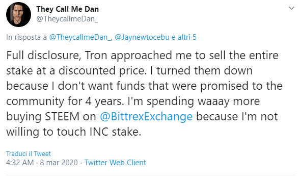 I then read a comment by @theycallmedan on Twitter in which he says that Justin's team has interfaced with him to sell these famous Steemit Inc account STEEMs at a discounted price ... Well it seems a bit of a paradox between what is written This morning and what Dan reports. It is clear that the ideas are not clear and probably, after these hot days, Justin wants to drop everything to the first bidder ... For the record Dan has refused, as he himself admits, as that nice nest egg STEEM are not for sale because they were intended, from the beginning, for the development of our community.