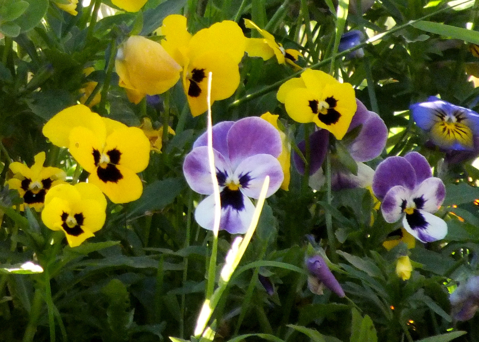 Cheerful pansies! All of these were self-seeded from a handging basket, a couple of years ago!
