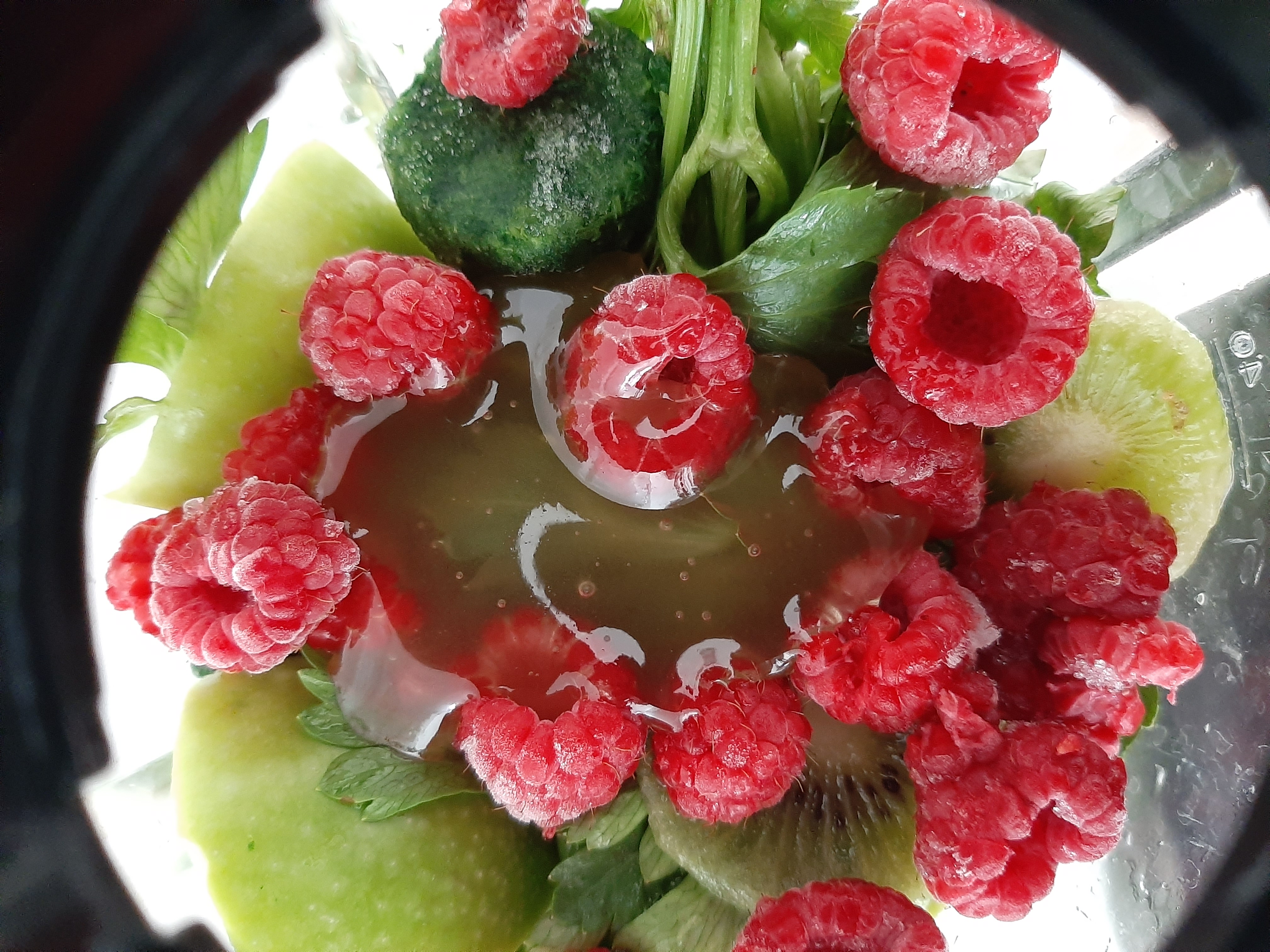 Для смузи нам понадобится малина, киви, яблоки, сельдерей и ложка меда. Нарежем очищенные яблоки и киви на среднего размера кусочки, поместим в блендер, добавим малину. Помоем сельдерей и отправим к остальным фруктам.