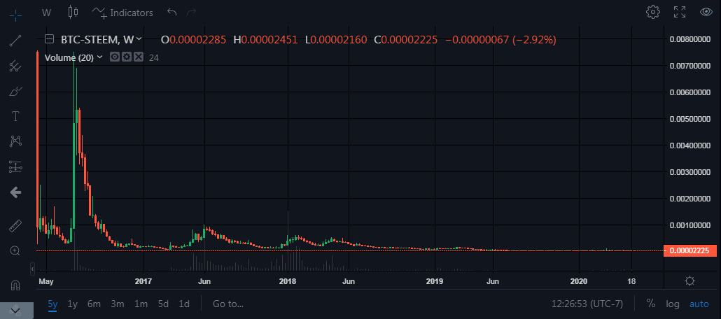 In fact, it looks like after it launched, STEEM basically has never made a higher high against BTC, only lower lows...