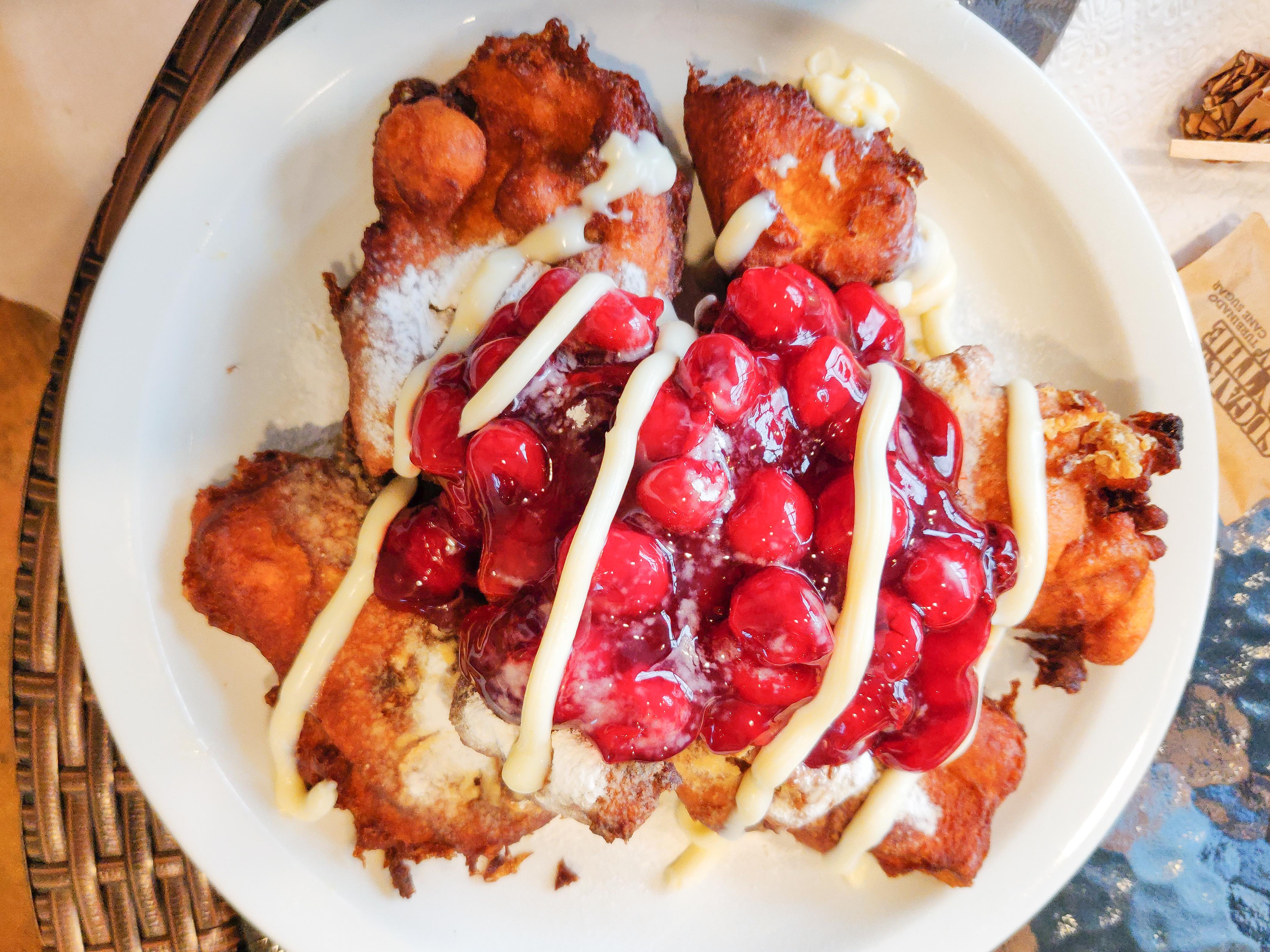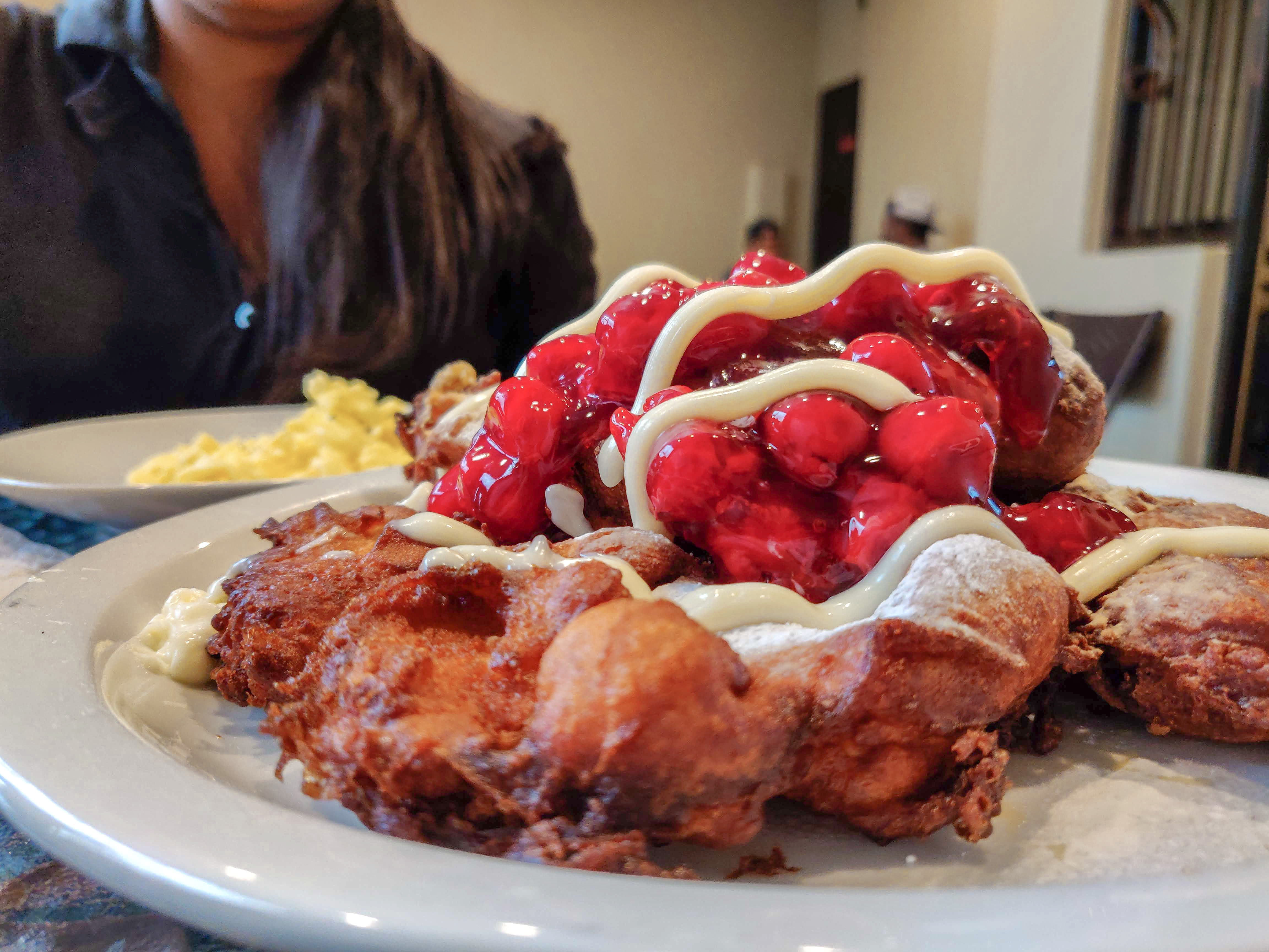 Another well liked dish of ours is the french toast. This one is usually shared as the portion size is huge one of us cannot eat it in its entirety. It is very tasty none the less and very beautiful, it reminds of winter in Canada for some reason. It is an unorthodox type of french toast, the kind that is deep fried. It is complemented with a dollop of cherry sauce, icing sugar and cream cheese icing. To me it seems like more of dessert if you ask me, but when you come out to eat breakfast/ brunch its an excuse to go all out I say!