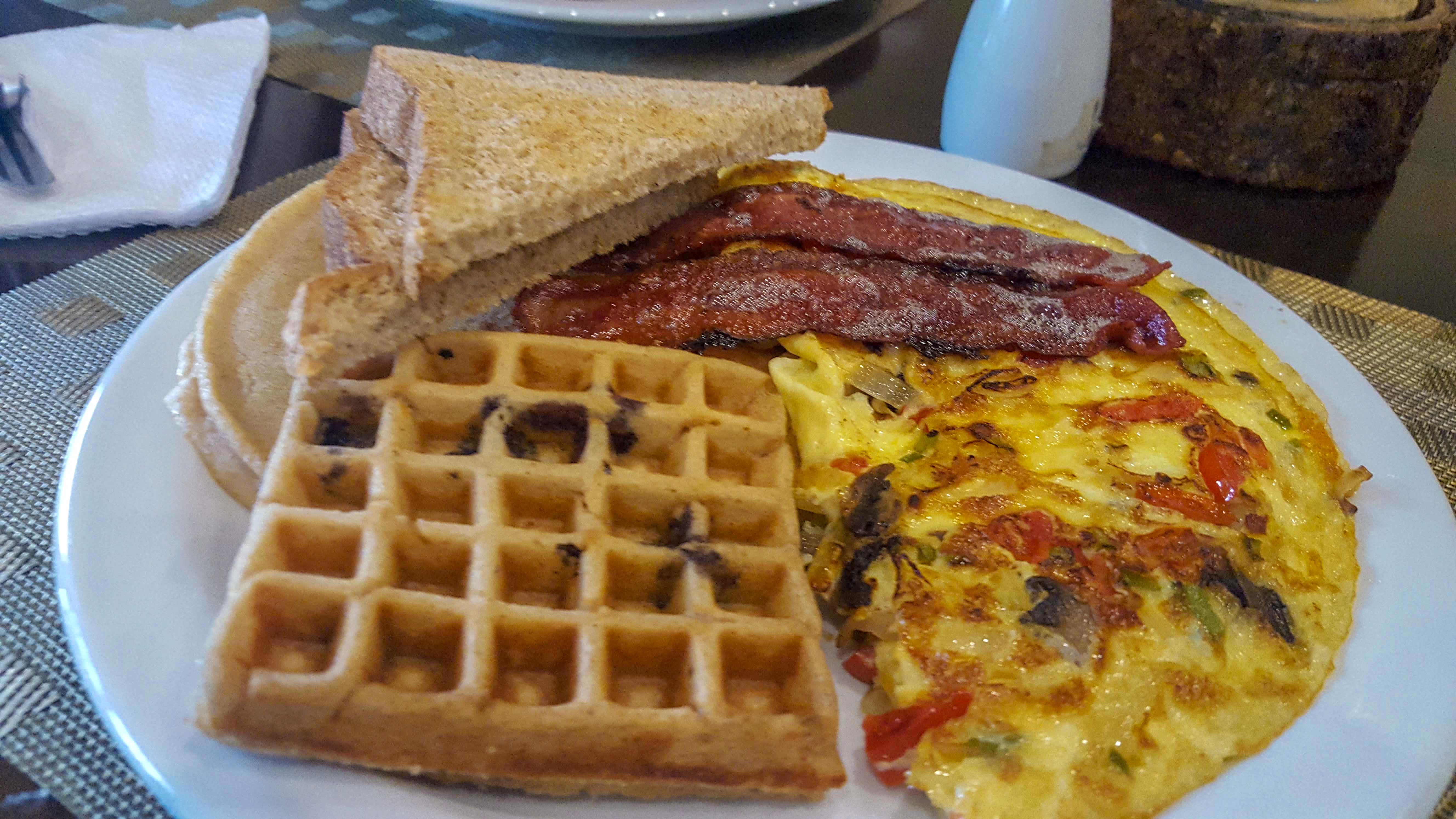 The menu is fairly large and spans from breakfast to lunch items and also includes a vast drink menu that covers cold and hot drinks. This would include the usual breakfast such as eggs, waffles, pancakes and so on as you'd expect then you'll see sandwiches, omlettes, paninis then burgers, a multitude of cheesy fries dishes and then pasta and so on. As I said its a large menu! There is the combo platter that we order which is an omelette, toast, turkey bacon and waffles or pancakes. This is a good way of sampling a few things without a large cost. There is a huge selection of fillings you can request in your omelette including breakfast meats, mushrooms, vegetables and of course cheese. The waffle and pancake batter, sadly is not made in house! For the price range we don't mind though.