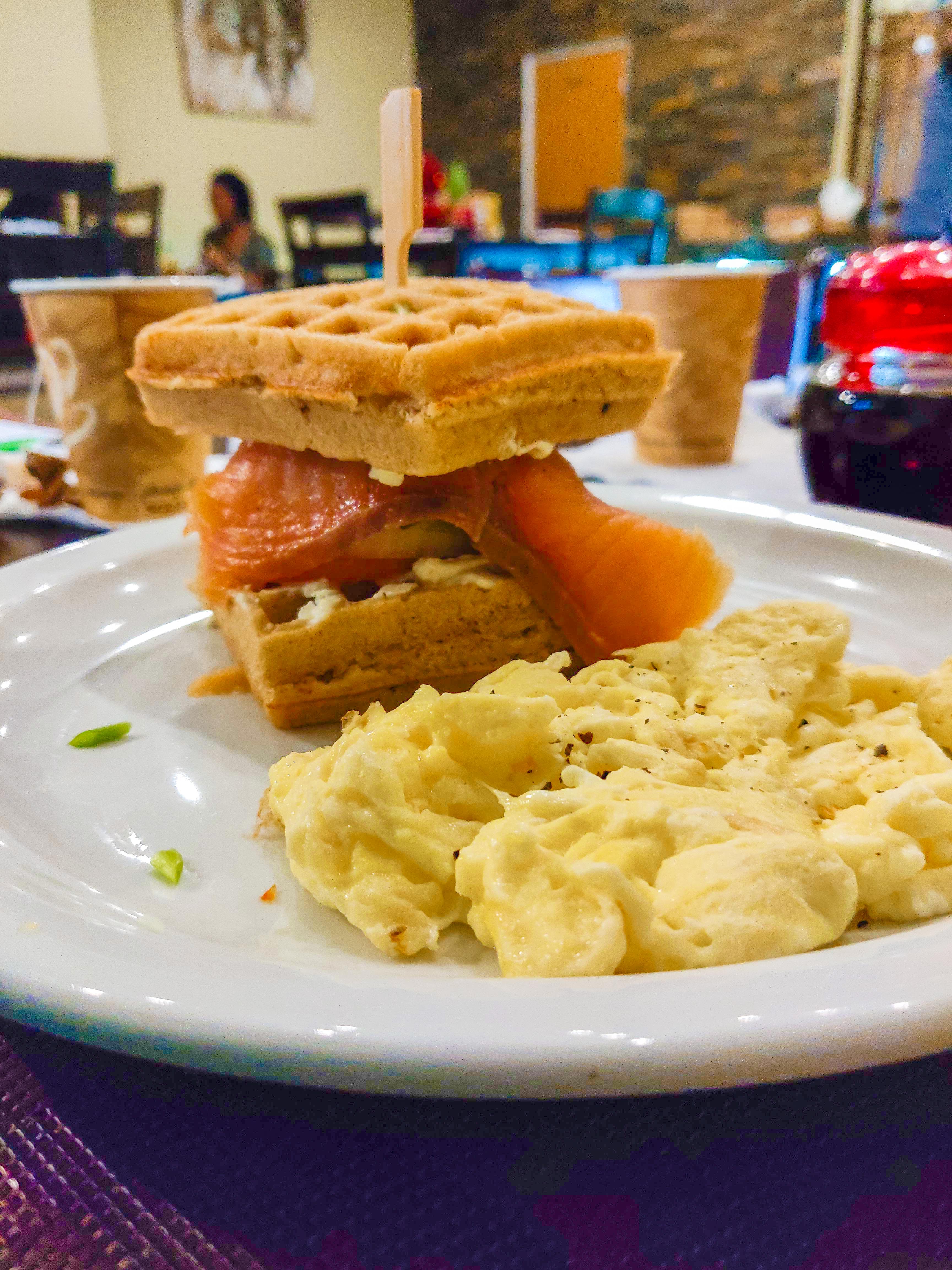 The last dish is named, I kid you not, on the menu as "DREDLOX" in all caps. I believe its a reference to the Rastafarian hairstyle "dreadlocks". This one is my utmost favourite as it marries two of my highly loved foods: smoked salmon and jalapenos which is the main flavour profile of this menu item. It is basically smoked salmon, cream cheese, jalapenos, onion and tomatoes in between two waffles. It may sound weird to some of you but the flavours play very nicely together and results in a magnificent dish! It comes with a side of eggs which to me completes the perfect breakfast along with a nice cup of tea. #Satisfaction!