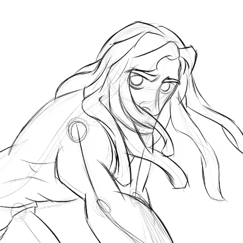 Realizo un esquema de varillas asemejando el esqueleto del personaje, para así poder lograr la postura cuadrúpeda muy característica de Tarzan, determino las proporciones del cuerpo, para la cabeza dibujo un leve círculo el cual divido por partes para posicionar los ojos, nariz y cabello.