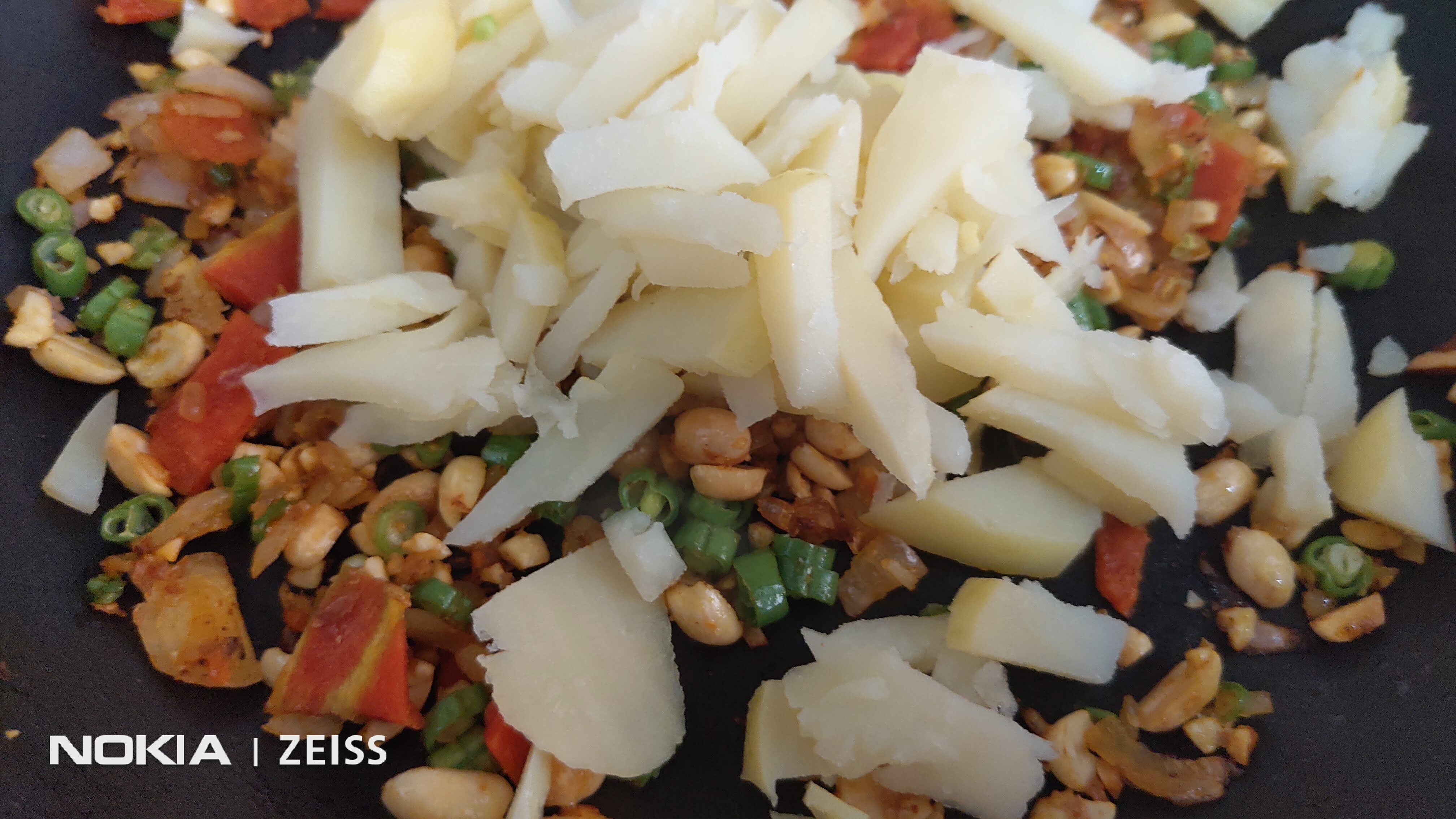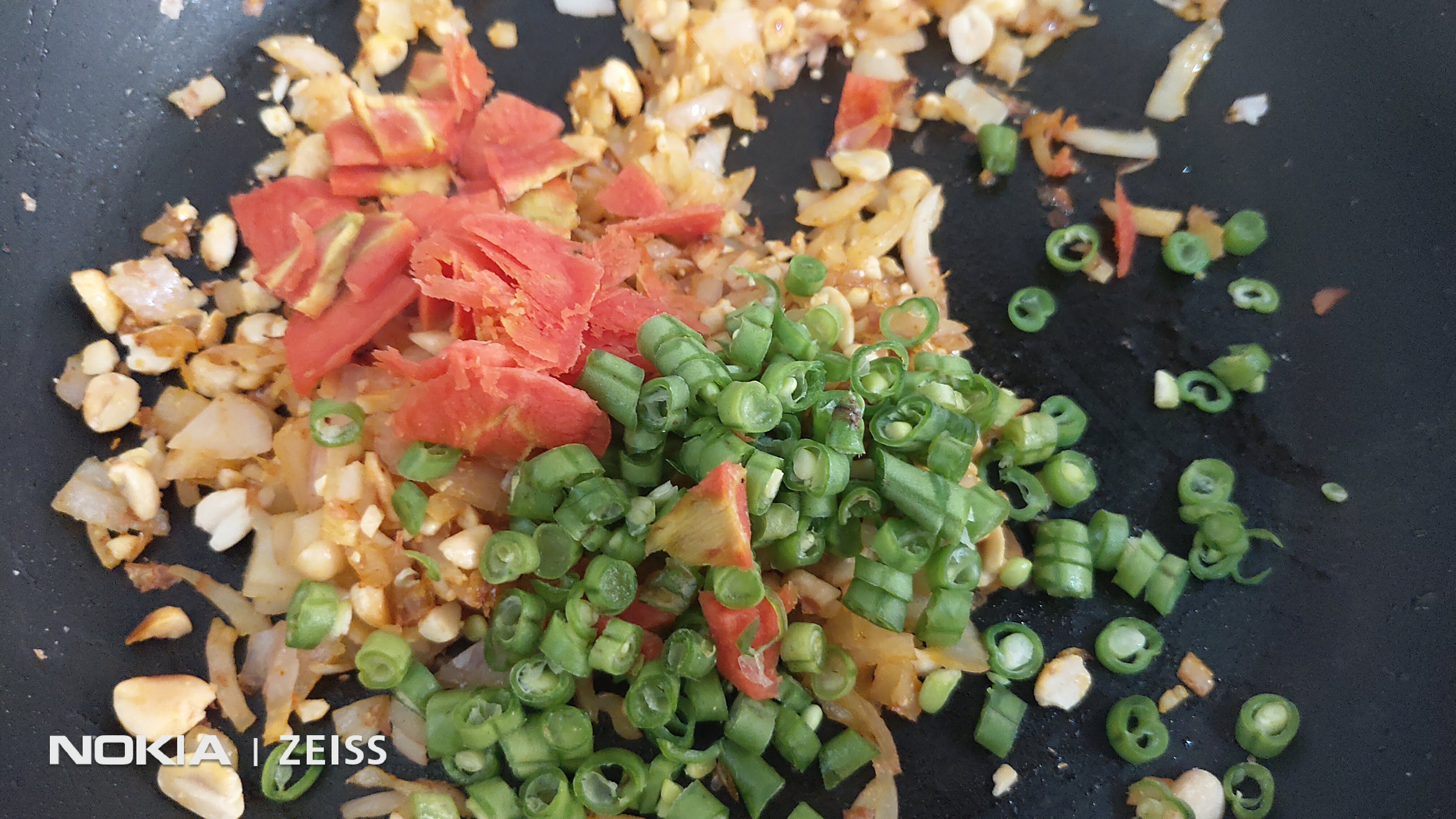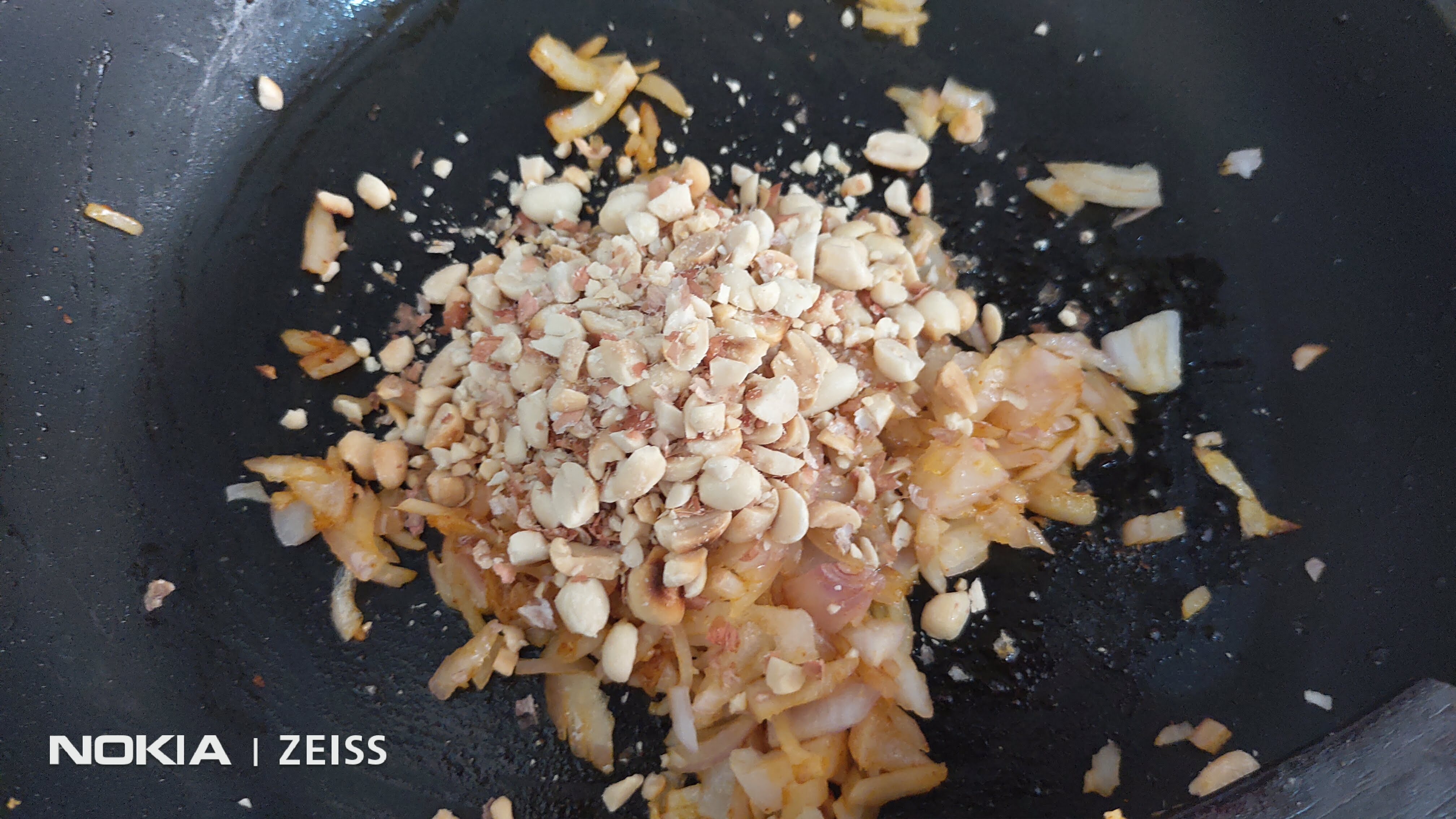 Add the crushed peanuts. Fry for a couple of minutes.