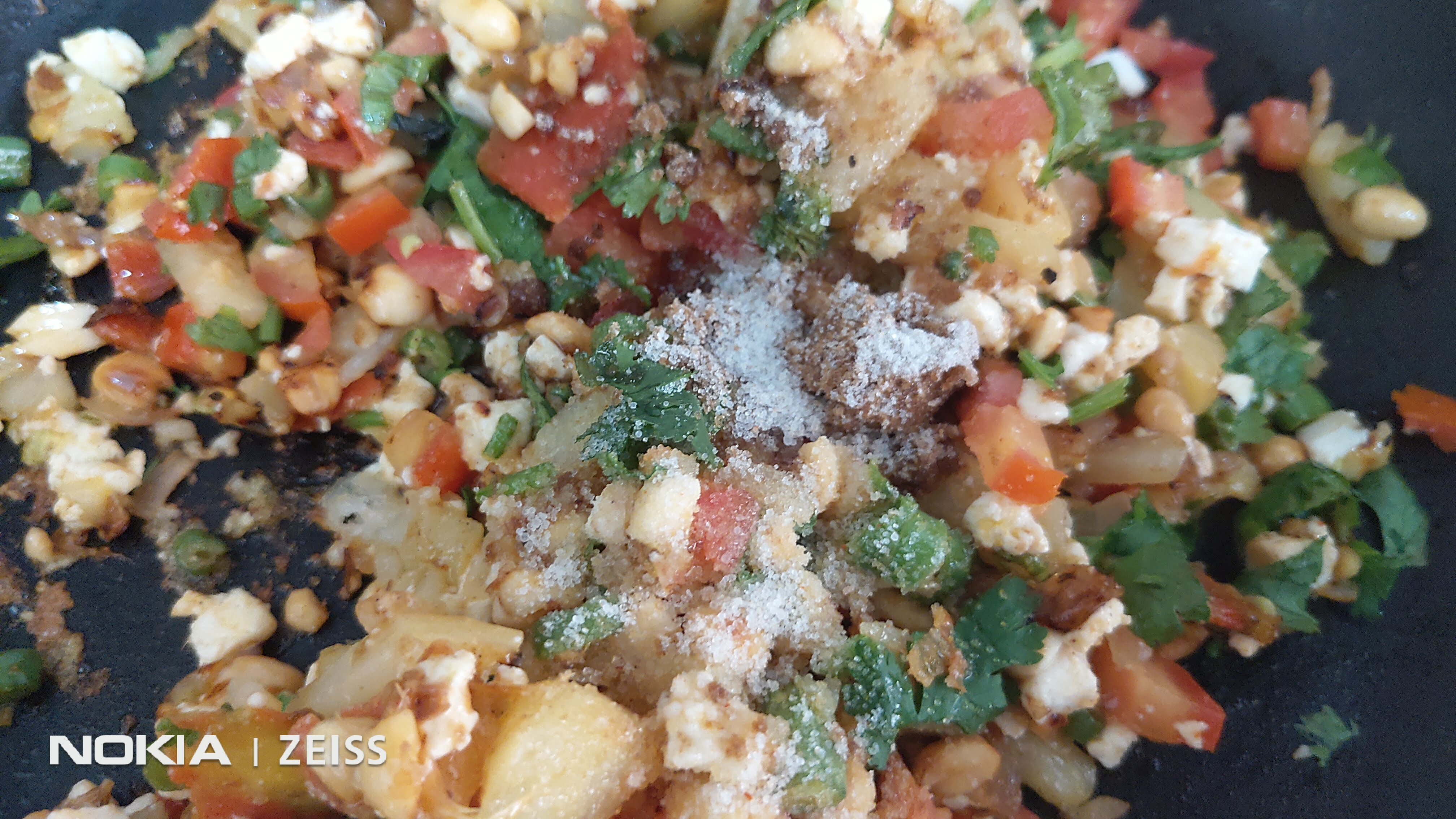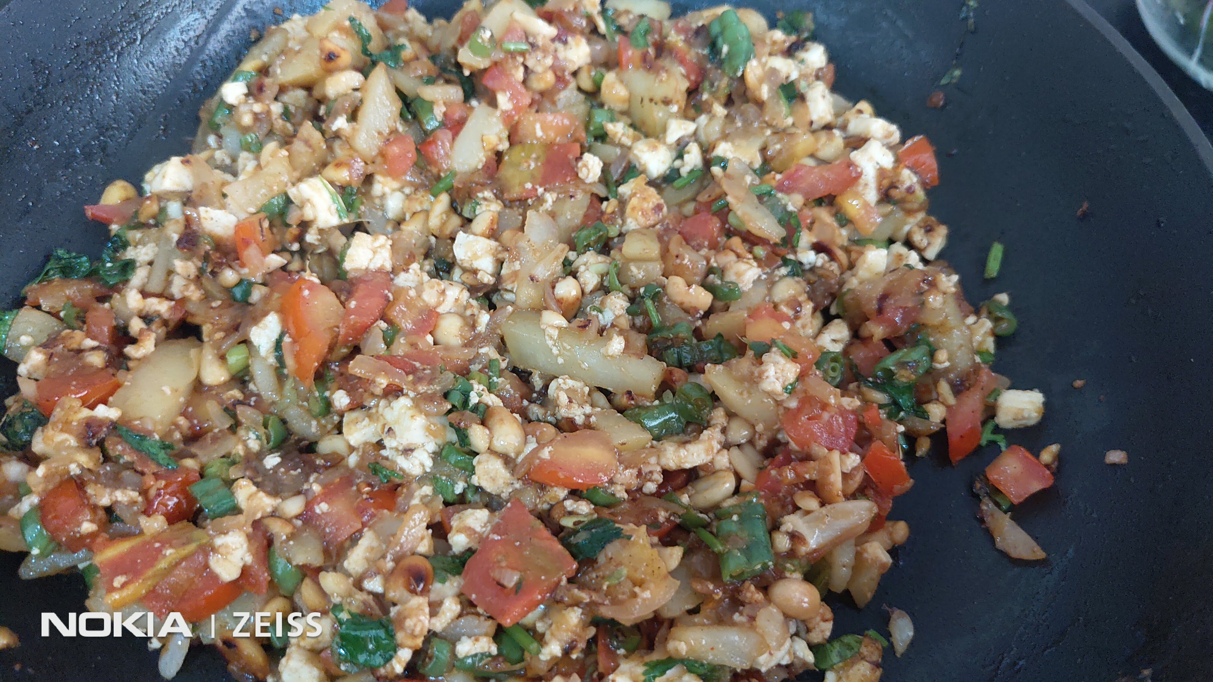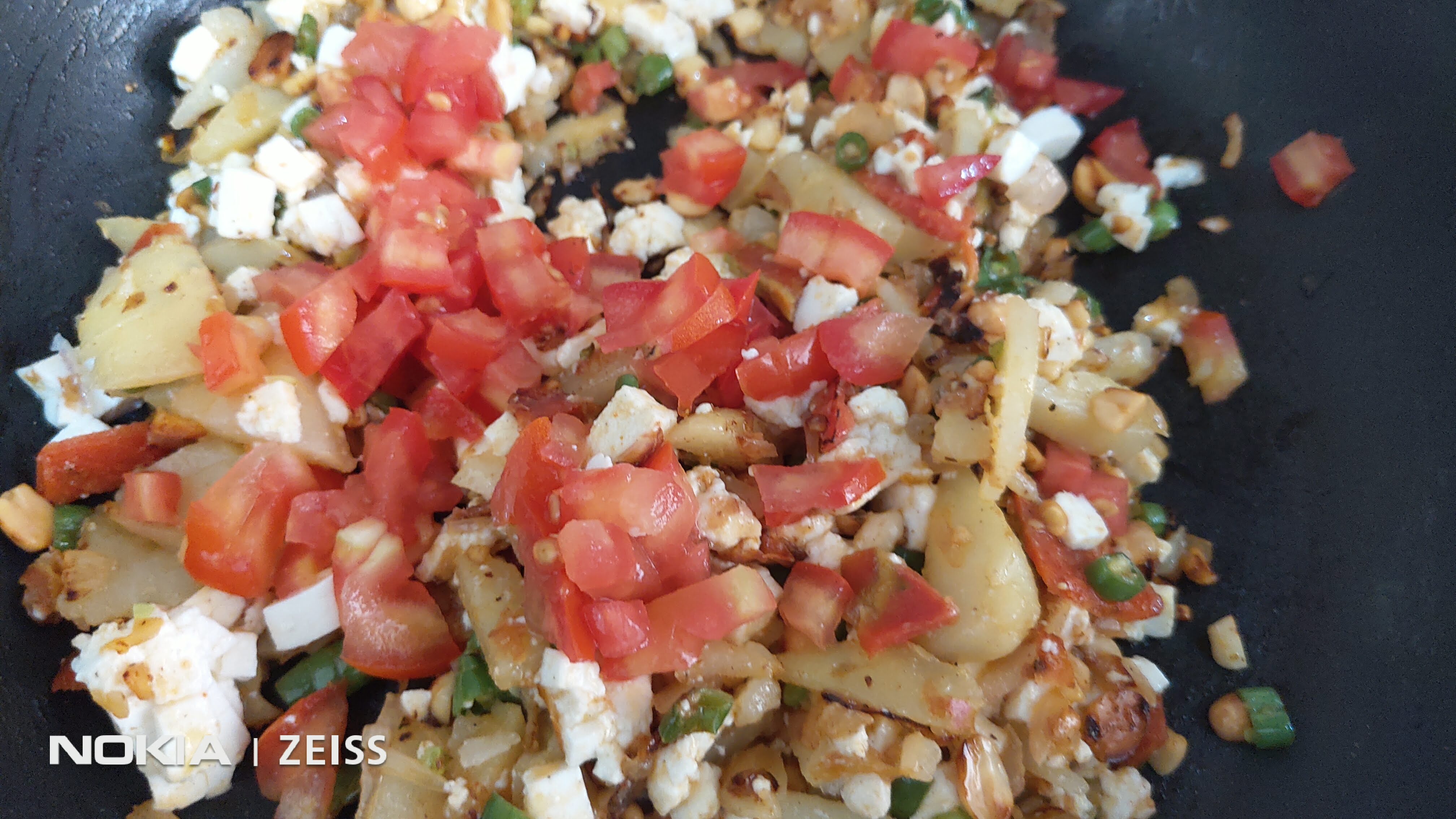 Add the crushed peanuts. Fry for a couple of minutes.