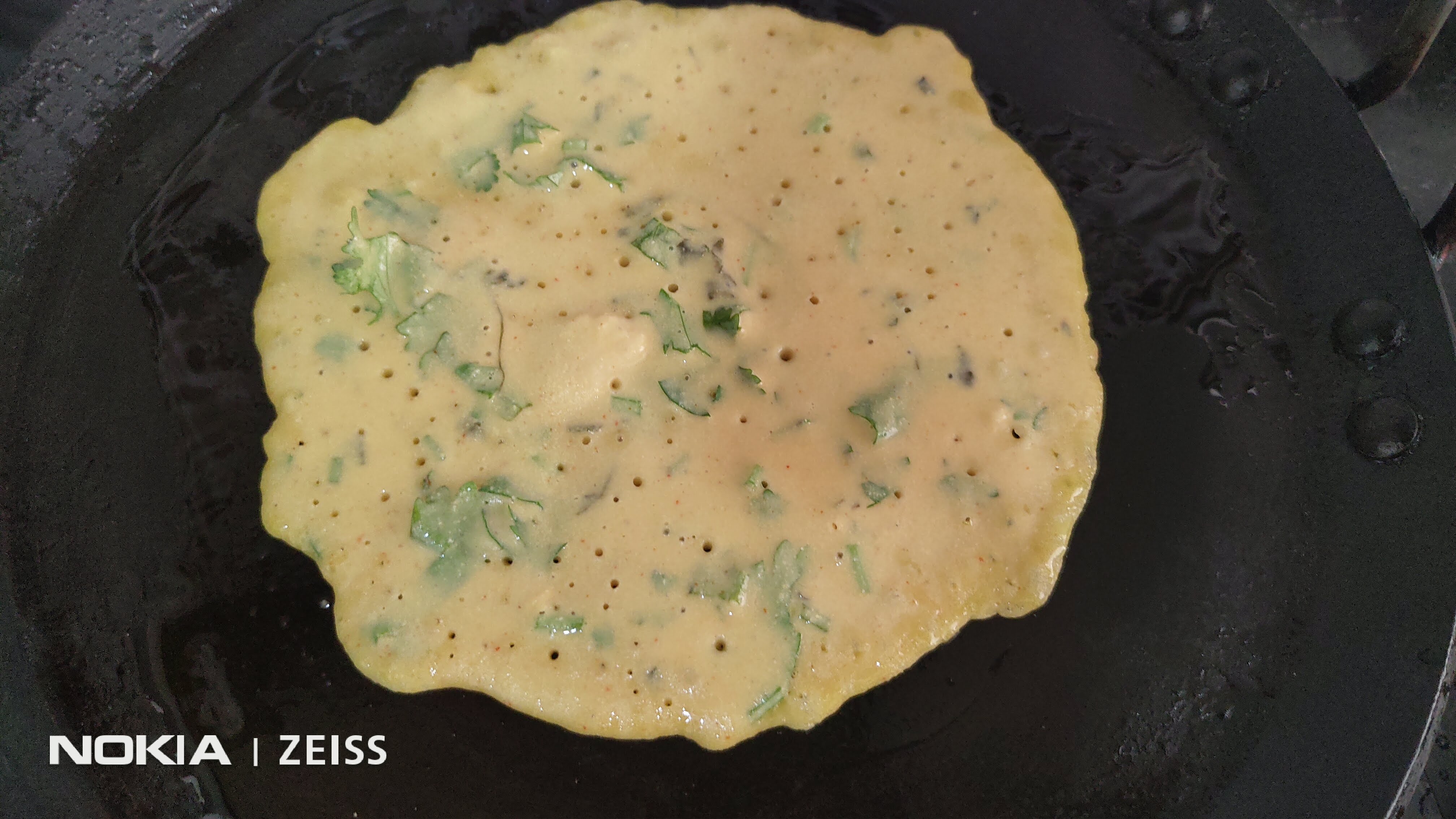 When it starts become crisp, gently spread one tsp of oil over it.Flip the pancake.