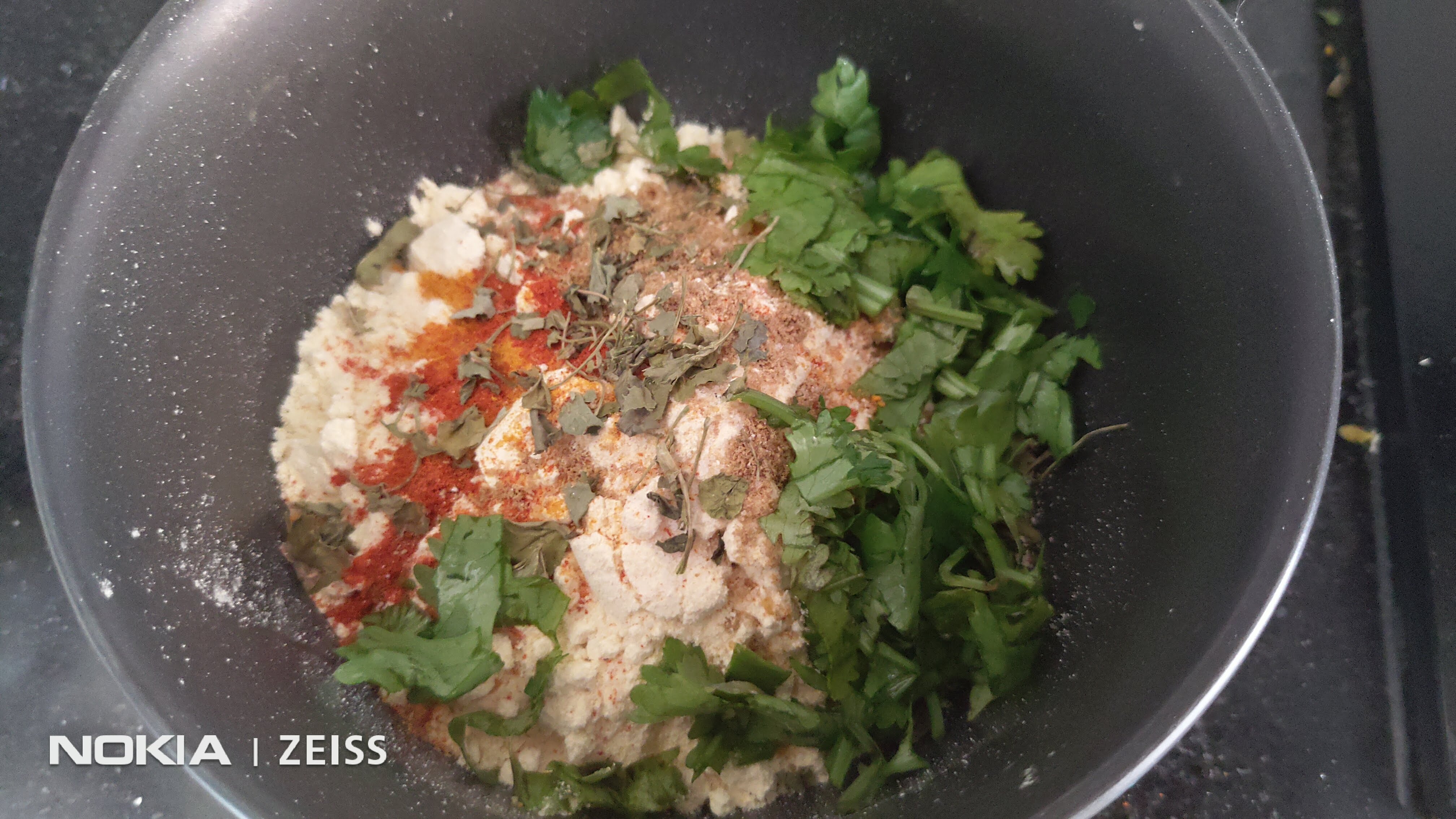 Mix all the ingredients together in a bowl : Chickpea Flour, rice flour, turmeric, coriander and red chilli powders, and salt.Add the green chilies and coriander leaves. Mix well