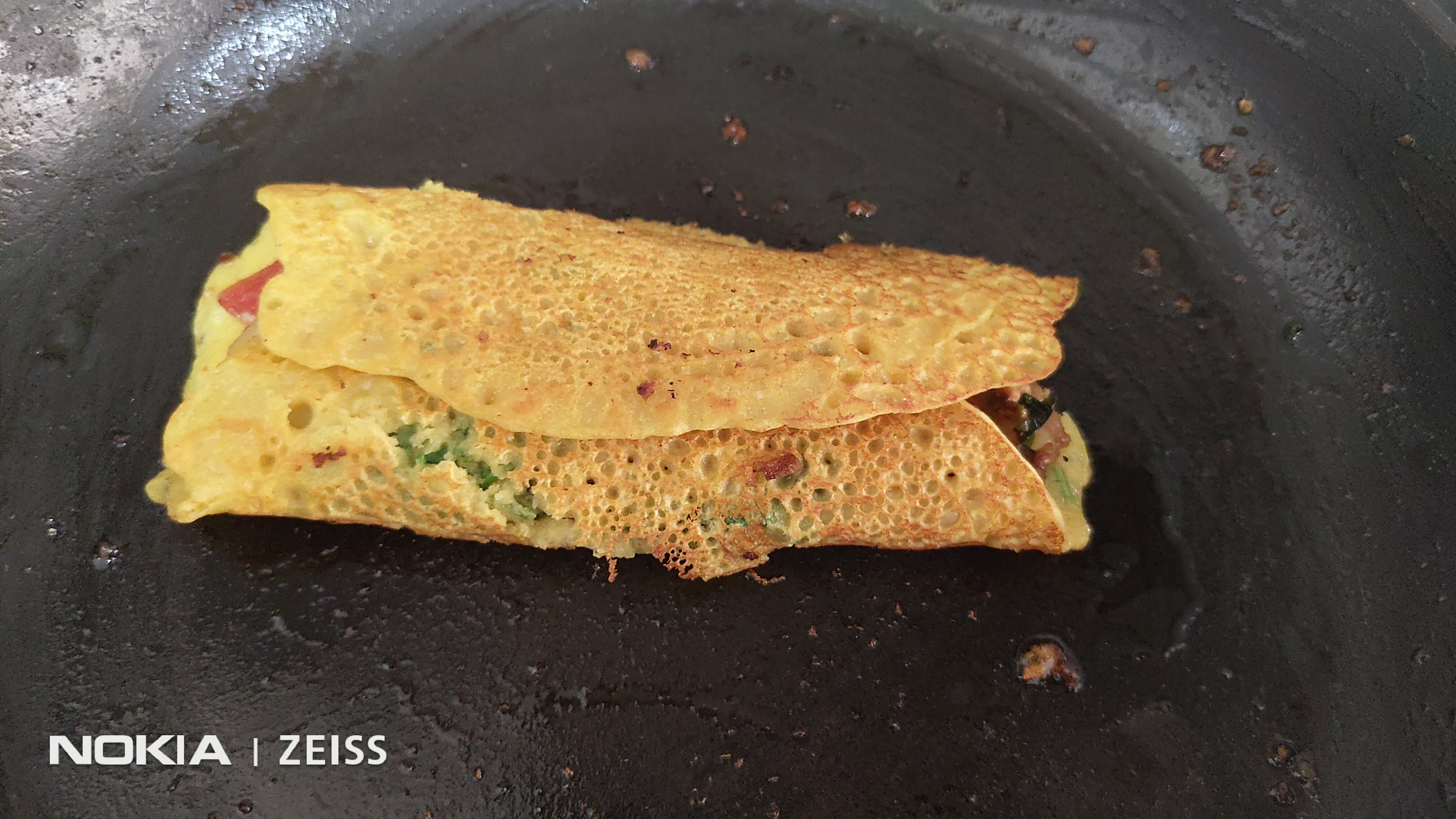 Flip and fry. Make sure the pancake does NOT open. Pour a spoon of cooking oil all around the folded pancake to ensure it fries well.Cook covered for a minute.