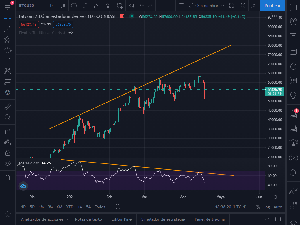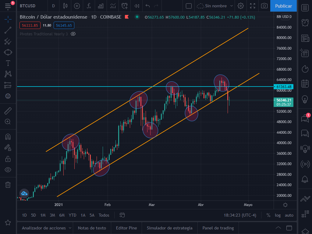 El pasado 12 de abril estuvimos analizando el BTC, donde lo encontrábamos en una canal alcista evidente en velas diarias. En ese analisis propuse dos posibles escenarios, uno alcista y uno bajista, pero también hable de lo saludable que sería una corrección en el BTC.
