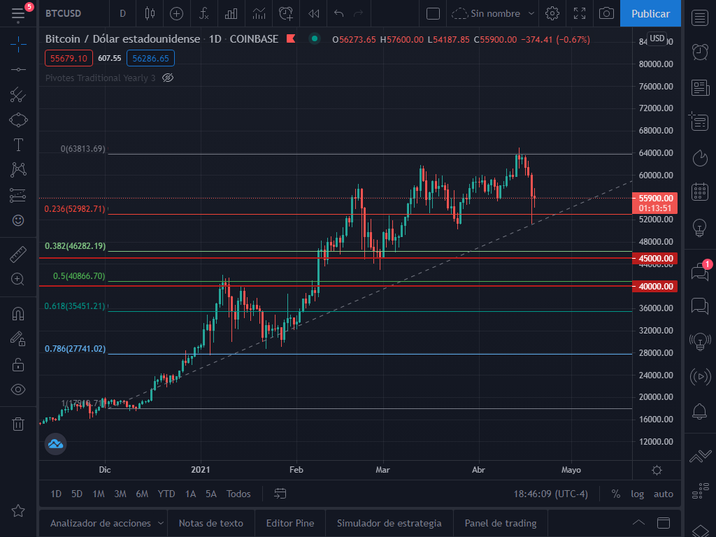 Ahora quiero mostrarles los puntos de corrección probables del BTC, donde se encuentran los soportes mas fuertes. Para esto he trazado un Fibonacci desde el comienzo del rally alcista hasta el ultimo pico.