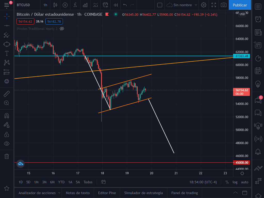 The most favorable and probable points for a correction are the .38 and .50 Fibonacci, which exactly match the supports at $45K and $40K. In fact, if we zoom in on the 1 hour time frame we find a bearish continuation flag pattern in the short term that would take the price to $45K. I show it below.