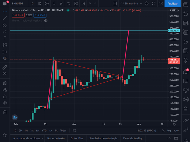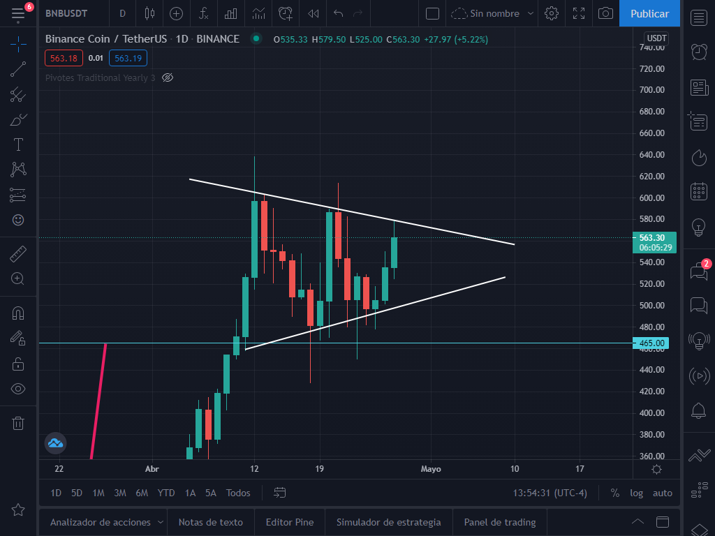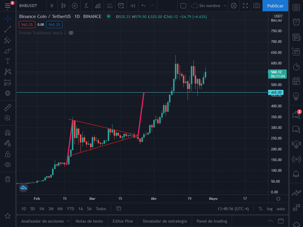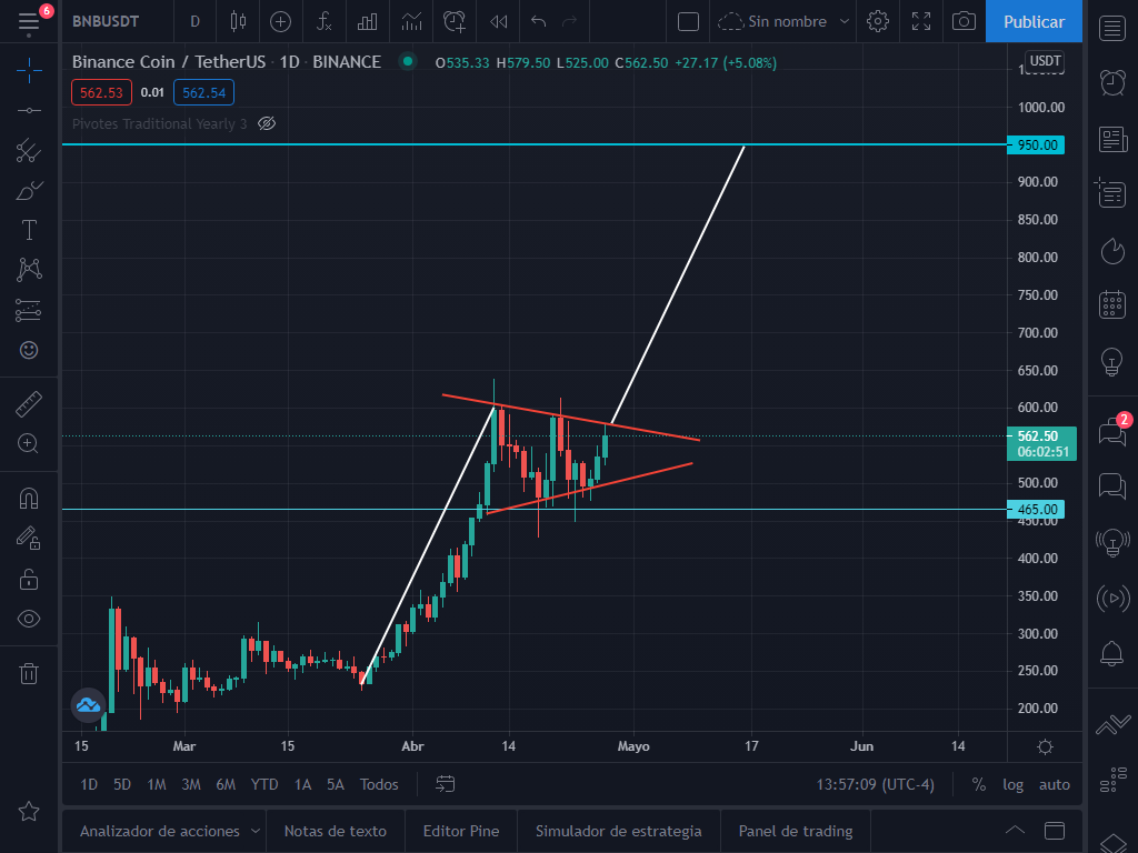 Como verán el BNB imprimió un máximo de 638$ y luego cayó a los 465$, punto al que habíamos trazado como objetivo alcista del banderín. Desde el 12 de abril se ha mantenido consolidando hasta el día de hoy y formó otro patrón de banderín alcista.