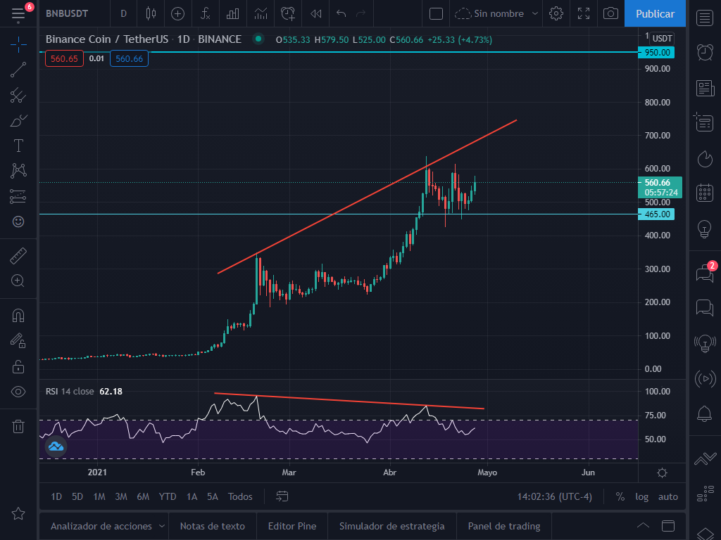 Sin embargo, debemos tomar en cuenta un dato interesante. En velas diarias se observa una divergencia bajista del BNB, por lo tanto hay que estar muy atentos al volumen.