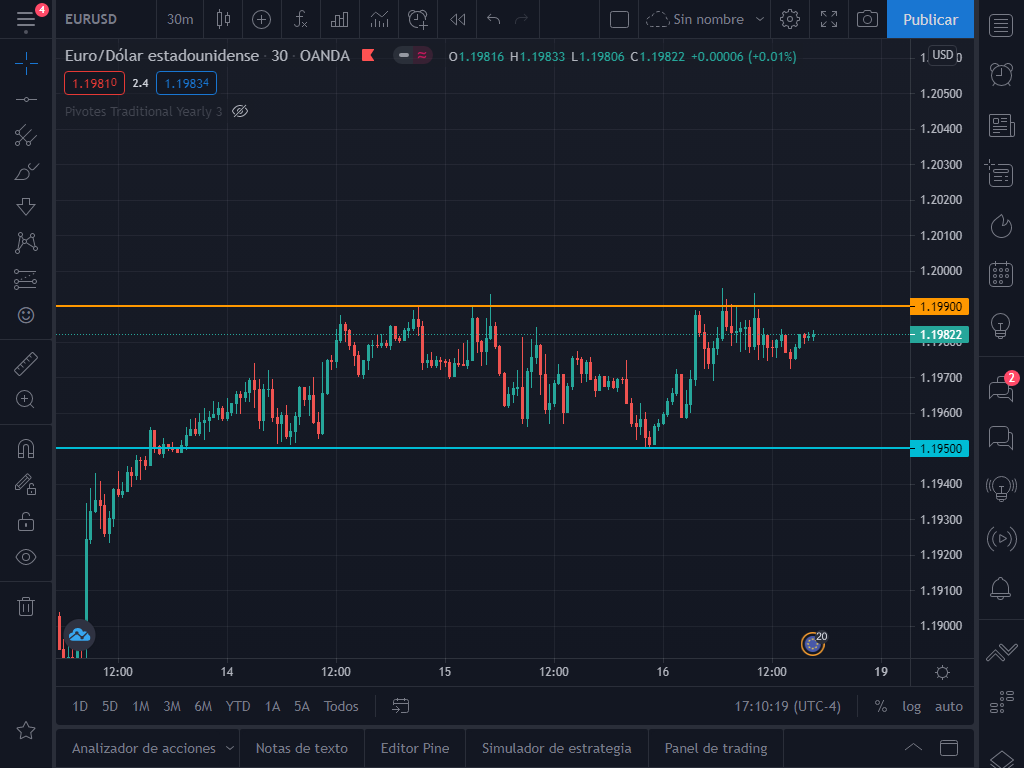 Al hacer zoom a velas de 30 minutos, podemos darnos cuenta que el precio ha creado un pequeño canal entre los precios 1.1990 y 1.1950.
