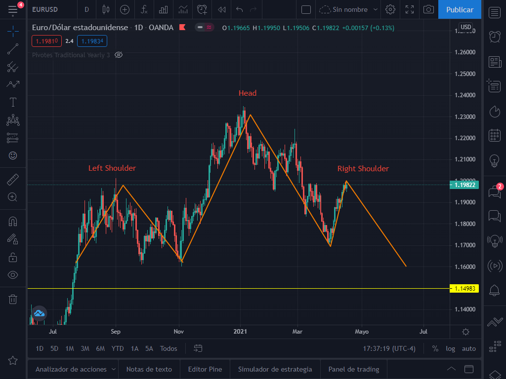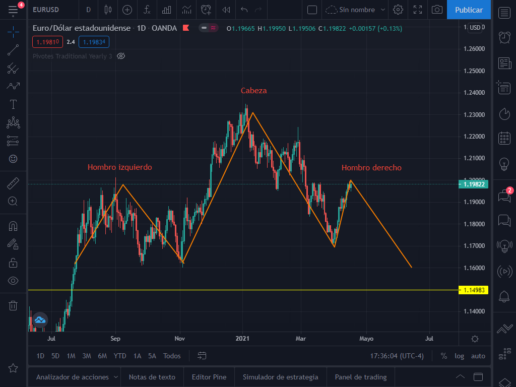 Como verán ya se ha formado el hombro izquierdo y la cabeza. Solo falta el hombro derecho y este se podría formar en el siguiente movimiento del EUR/USD. Si nuestro escenario 2 se da y el precio cae hasta el piso en 1.16, tendríamos el patrón completado.