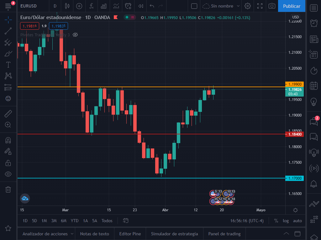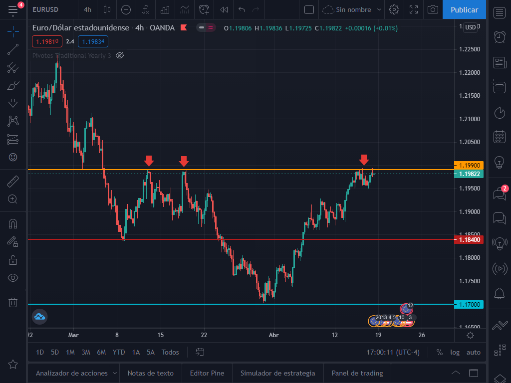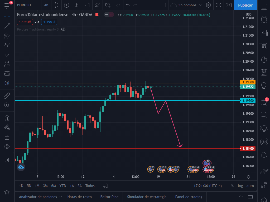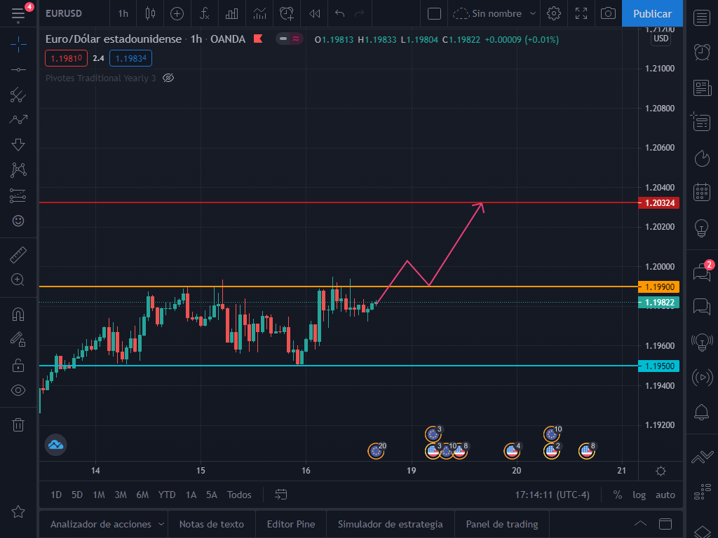 Ahora quiero analizar con ustedes lo que el par podría hacer a continuación. Como podrán observar el par ya ha tocado 3 veces la resistencia en la zona de 1.1990, lo que la vuelve bastante critica para los toros.