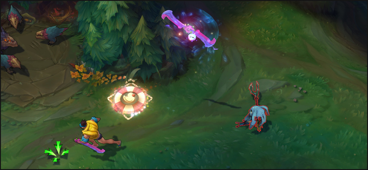 The spinning axe ricochets off the target high up into the air, landing 2 seconds later at a location determined by Draven's current movement. If Draven catches an axe, Spinning Axe is applied for no additional cost on his next basic attack.