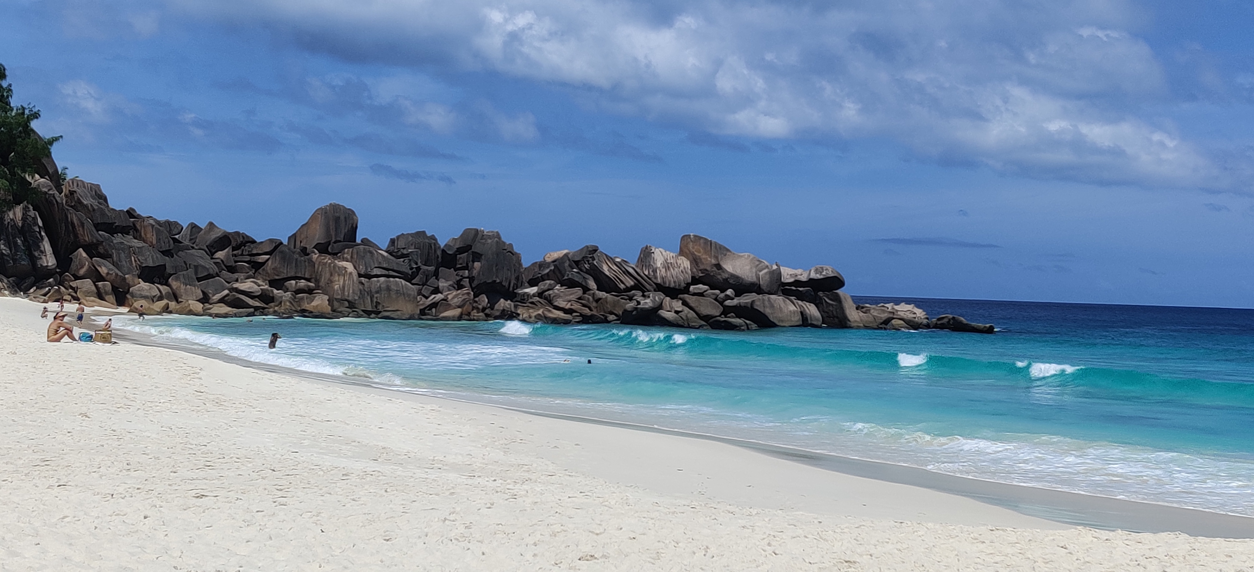 Blue Water White Sand Grey Mountain.... a perfect combinationsteemCreated with Sketch.vc1504 (39)in GEMS • 6 years ago Grand Anse, La Digue, Seychelles Captured on One Plus 7t Pro #photography #ocean #sealove