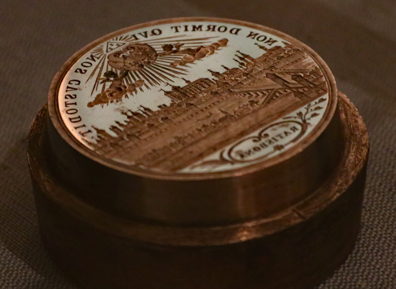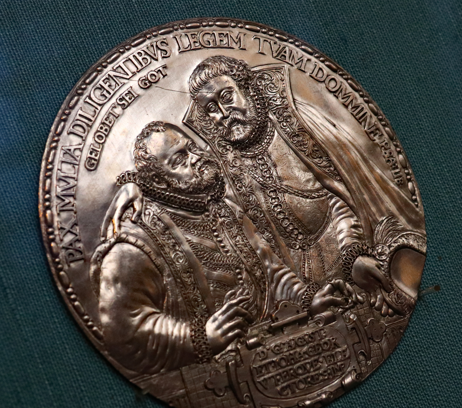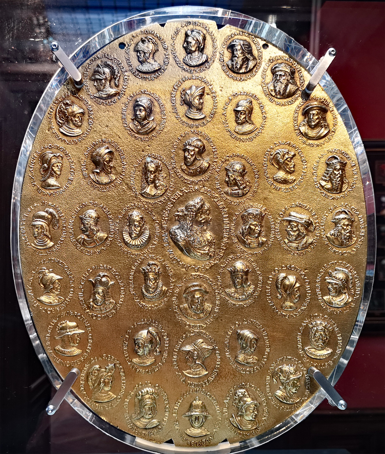 The Alchemical Medallion is the most famous object of the Coin Collection. According to the Latin inscription on the reverse of the coin, its name derives from the fact that the coin, which initially looked silvery, was dipped in a liquid in the presence of Emperor Leopold I and, in the process, turned into gold due to a "true and perfect metallic transformation". The family tree of the emperor is shown on the picture page.