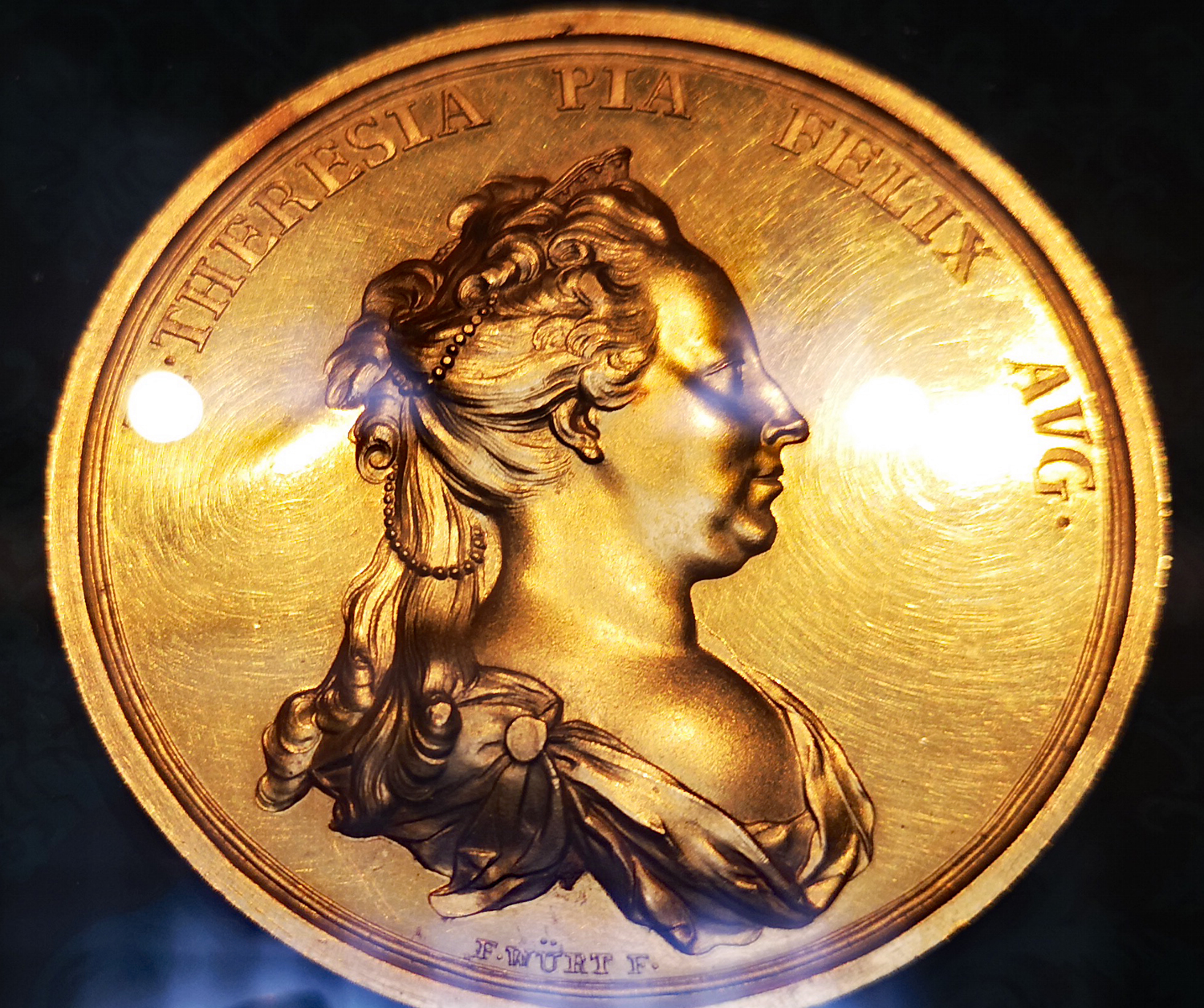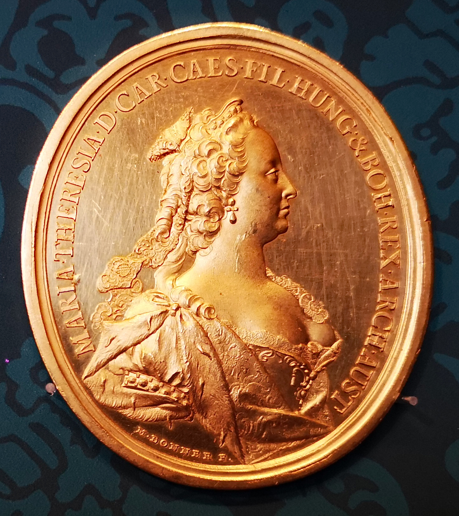 Das Porträt von Kaiserin Maria Theresia (1717-1780) wurde millionenfach auf Medaillen geprägt. Anlässe waren entweder privater Natur (Geburten, Hochzeiten, Krönungen, Todesfälle) oder politische Ereignisse. Durch die Verbreitung der Medaillen war es auch dem gemeinen Volk möglich, indirekt am höfischen Geschehen teilzunehmen.
