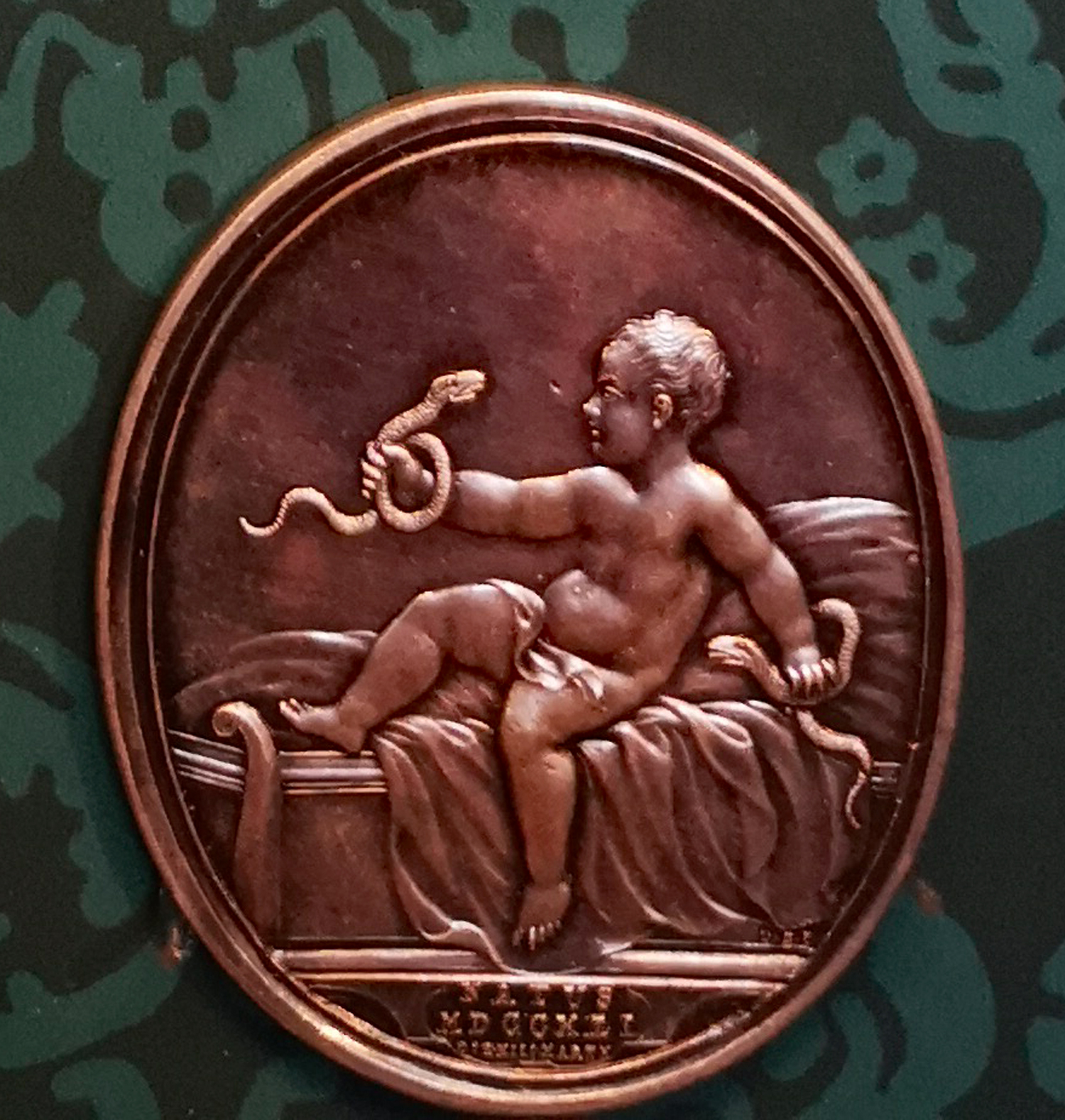 Popular motifs with domestic and foreign medal manufacturers were the births of children from the House of Habsburg-Lorraine. Thus Joseph, the long-awaited first male offspring, was staged as heir to the throne even as a child. On this medal he is given supernatural powers, like Hercules, the hero of Greek mythology.