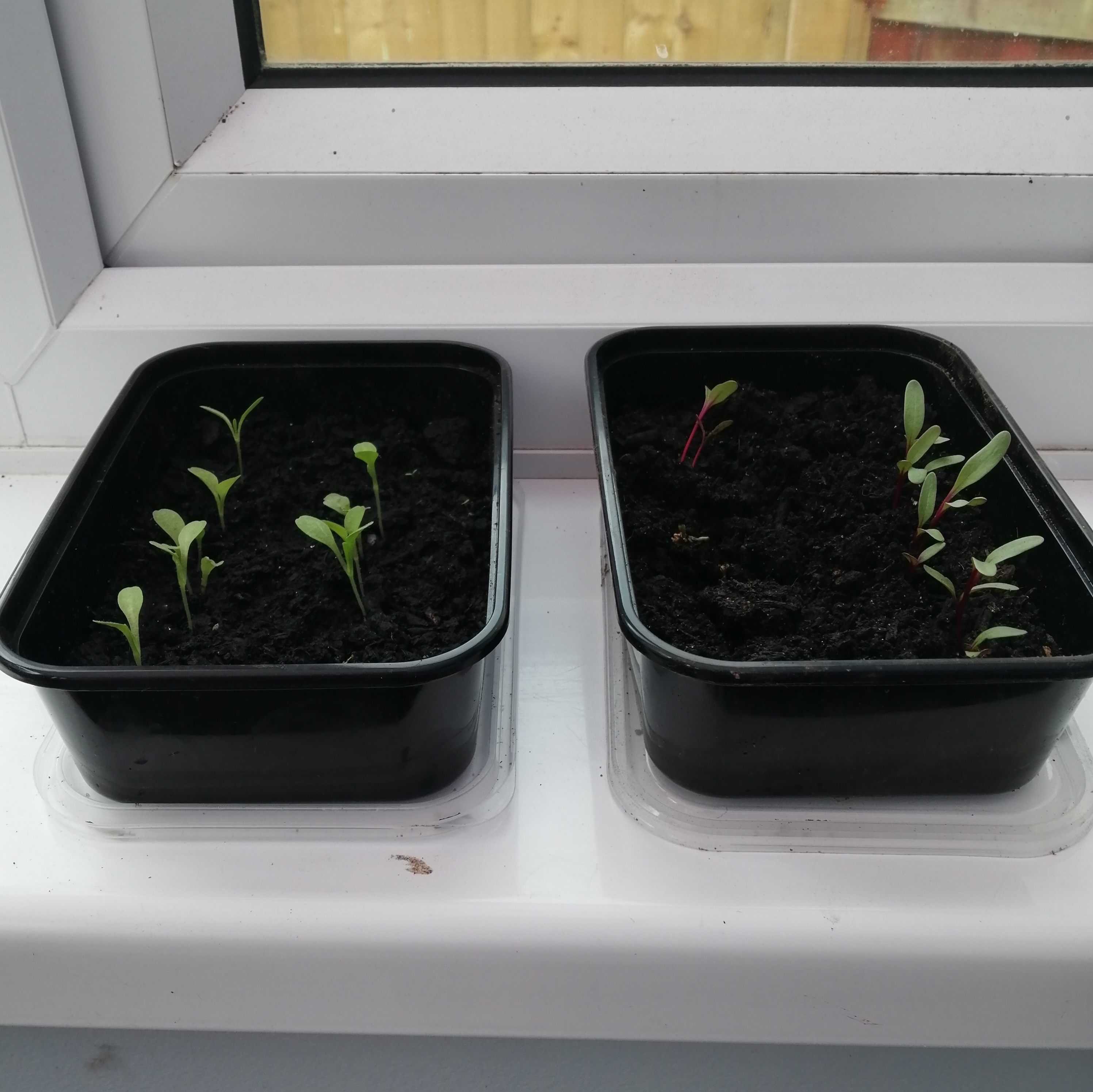 Old "takeaway" trays are perfect for Mixed leaf salad and betroot