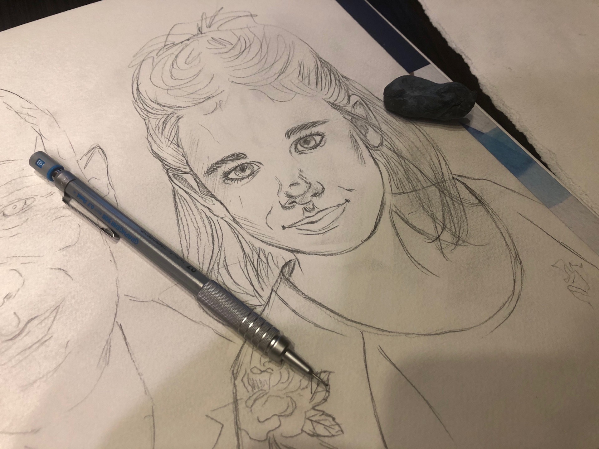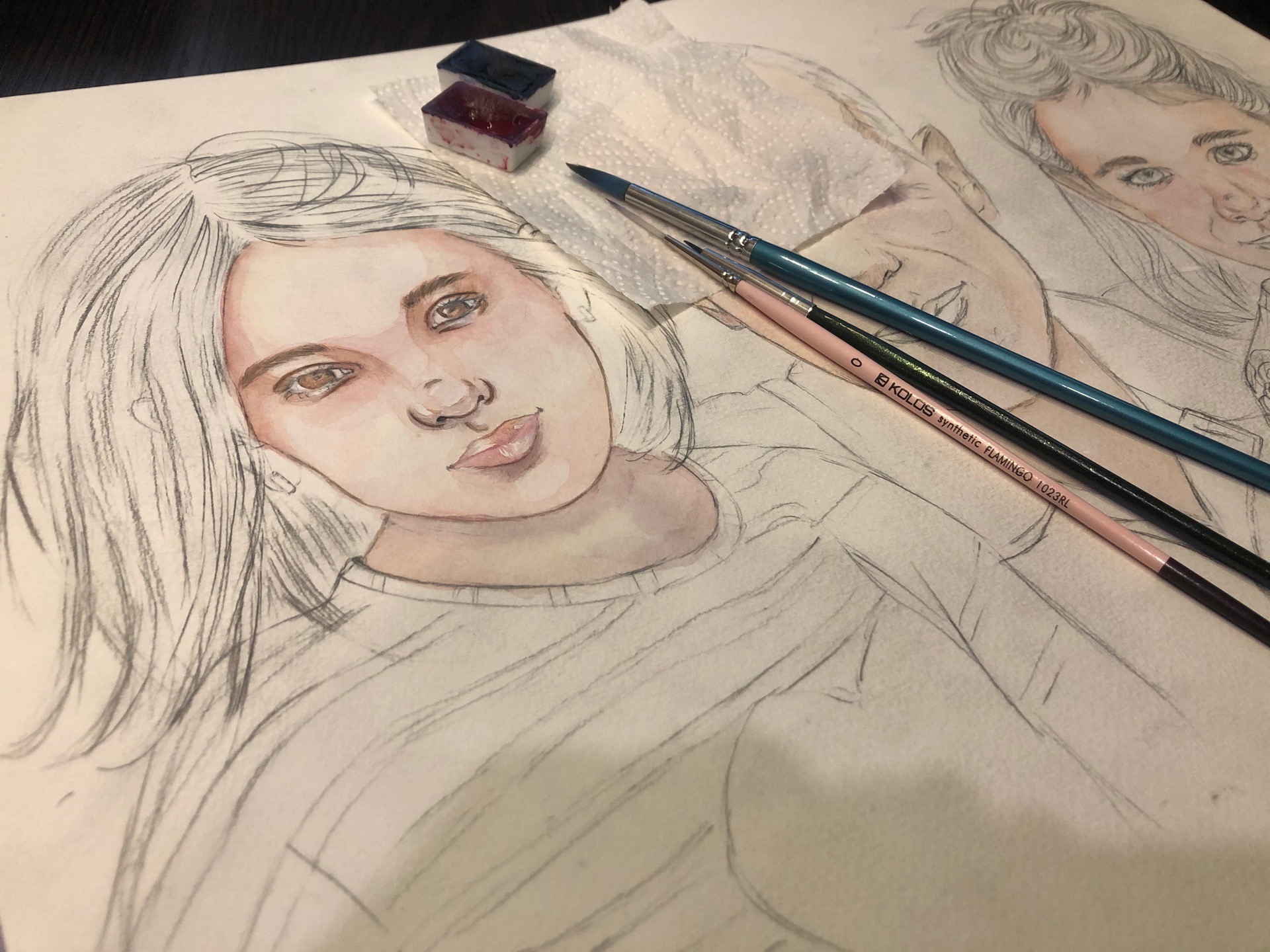 Second phase. This is a work in color. I paint portraits in watercolor. I love watercolor because it dries quickly and lies beautifully on paper.