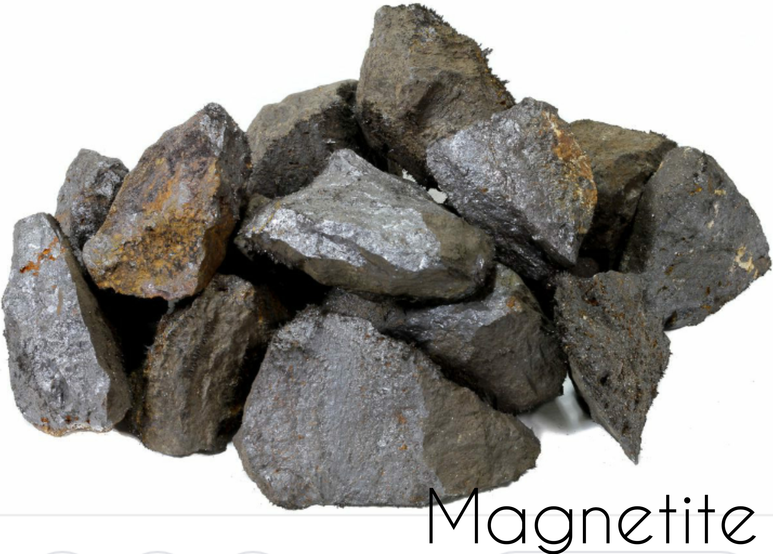 Magnetite is a iron black colored mineral strongly magnetic rock which have black streak and metallic lustre.Usualy have granular and massive form and shows conchoidal fracture .It has hardness of 5.5 to 6.5 and have a high specific gravity of 4.8 to 5.4.