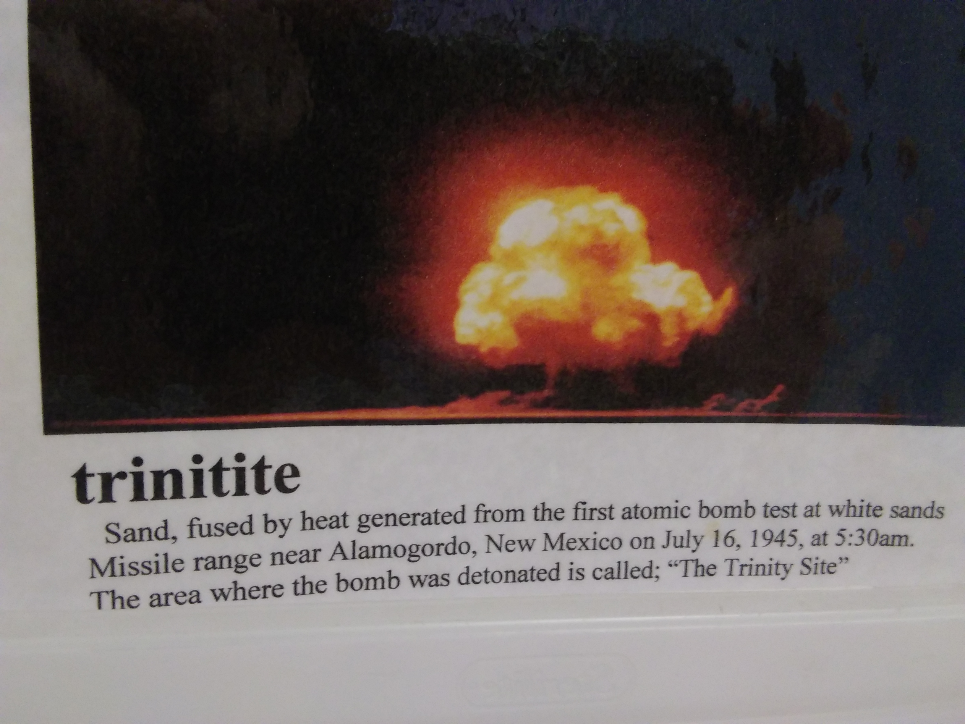 As the picture shows; it is fused sand from the first atomic test blast in Trinity New Mexico. We had quite a bit of it, but in 2017 we had a run of customers buying it and quickly ran out. Since then I have been trying to find more at a reasonable price. No such luck. I'm still looking though.