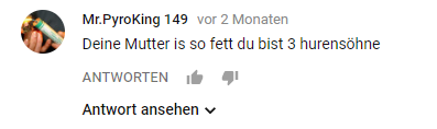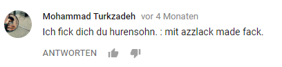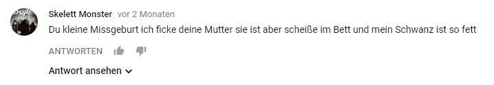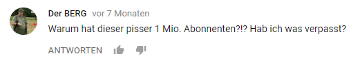 Wenn man diesen Kommentar übersetzen würde, würde dort stehen: "Der hat 1 Millionen Abonnenten? Warum ist der so erfolgreich? Ich möchte auch! Wenn der das alles haben darf, dann will ich auch! DISLIKEEE!"