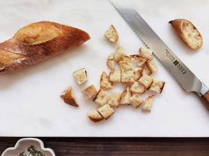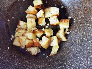 Put the baguette pieces into the pan and stir - fry until they turn an attractive caramel color. Then sprinkle some parsley flakes over them.
