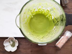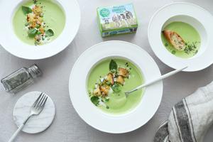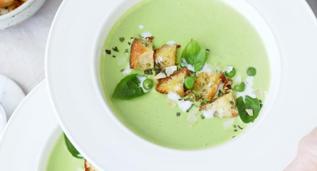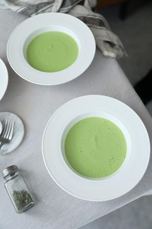 Pour the pea soup into an aesthetically pleasing Western - style dinner plate.
