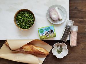 Place the baguette pieces, pea kernels, and parsley flakes in sequence. Garnish with herbs, then drizzle a little coconut milk.