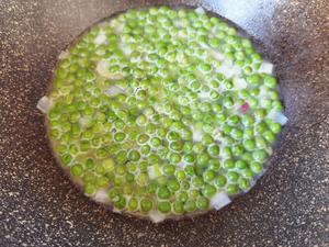During this season, I use frozen peas. I just add water and the sautéed onions, and cook for 7 minutes.