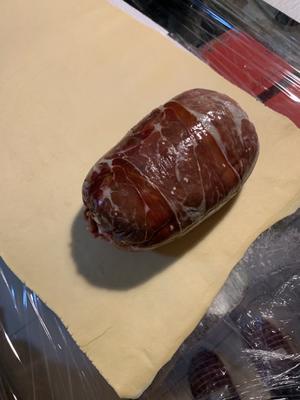 At this time, prepare the puff pastry (you can buy frozen puff pastry in the supermarket). Take the puff pastry at room temperature, spread it out and roll it thinner. Take out the ham - wrapped steak roll that has been shaped, remove the cling film, place it on the puff pastry, and roll it up. Ensure that the puff pastry completely encircles the steak roll. Cut off the excess puff pastry, then pinch the bottom and both ends to seal. Wrap it tightly with cling film again and place it in the refrigerator to set for at least 1 hour (it's also okay to leave it in the refrigerator overnight).