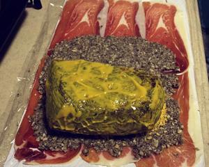 Lay a layer of cling film on a clean table. Place slices of Parma ham on the cling film. The length of the ham arrangement should be slightly longer than the circumference of the steak to ensure that the steak can be wrapped. Spread the cooled mushroom paste on the ham slices, with an amount sufficient to cover the steak.