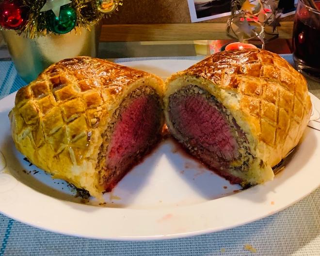 And thus, the Wellington steak is completed. Baking for 40 minutes results in a medium doneness, and when you cut it open, you'll see the tender, pink - hued filet. If you prefer your steak a bit more well - done, you can extend the baking time by 5 minutes.