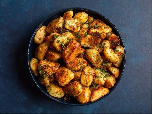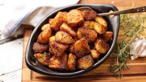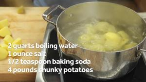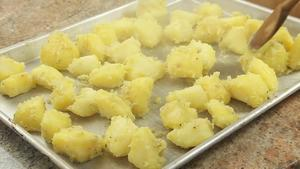 Cut the potatoes into large pieces. Add one liter of water to a pot and bring to a boil. Add 15 ml of salt and 1 ml of baking soda. Put the potatoes in and cook over low heat until they are easy to cut, about 10 minutes. Adding baking soda is to make the potatoes alkaline, so that the surface will be crispier when baked. See the picture below for comparison.