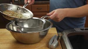 Strain the oil into another container. I usually wait until the potatoes are cooked, drain the water and then strain it directly into the potatoes, but if the oil temperature is too high, the garlic may become mushy if you wait too long. Don't throw away the minced garlic and rosemary, you filter them out at this step because they will become mushy if you roast them together.
