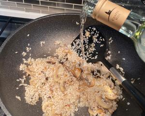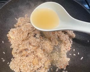 Start by adding chicken broth one spoonful at a time and stir-frying. After each spoonful of chicken broth is added, stir-fry until the rice has absorbed the broth before adding the next spoonful. Stir-frying the rice takes about 18-20 minutes. In the last 3-5 minutes, you can taste the rice to find the texture you like. Then add appropriate amounts of salt and pepper and mix well. When the half-cooked mushrooms are added, add them to the pot and stir-fry together