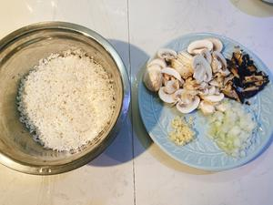 Prepare the ingredients, chop the onion and garlic, slice the mushrooms, soak the dried mushrooms and slice them, and reserve the soaking water for later use; wash the rice and drain it.